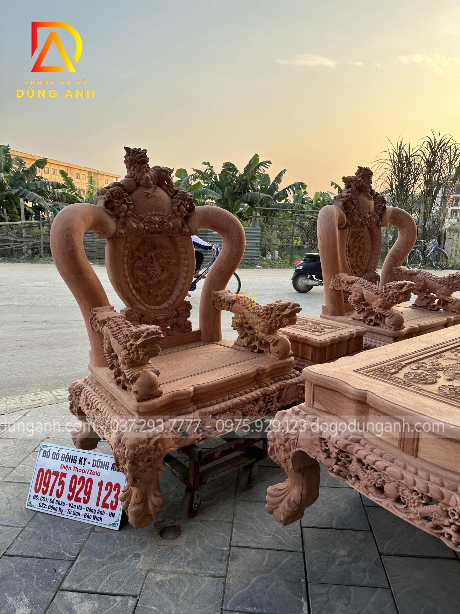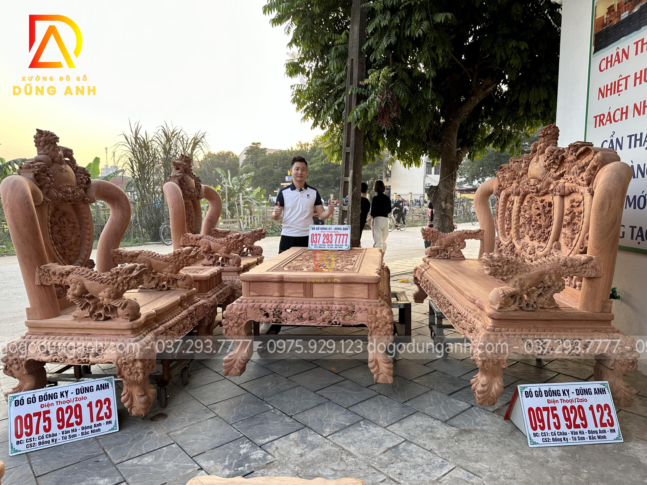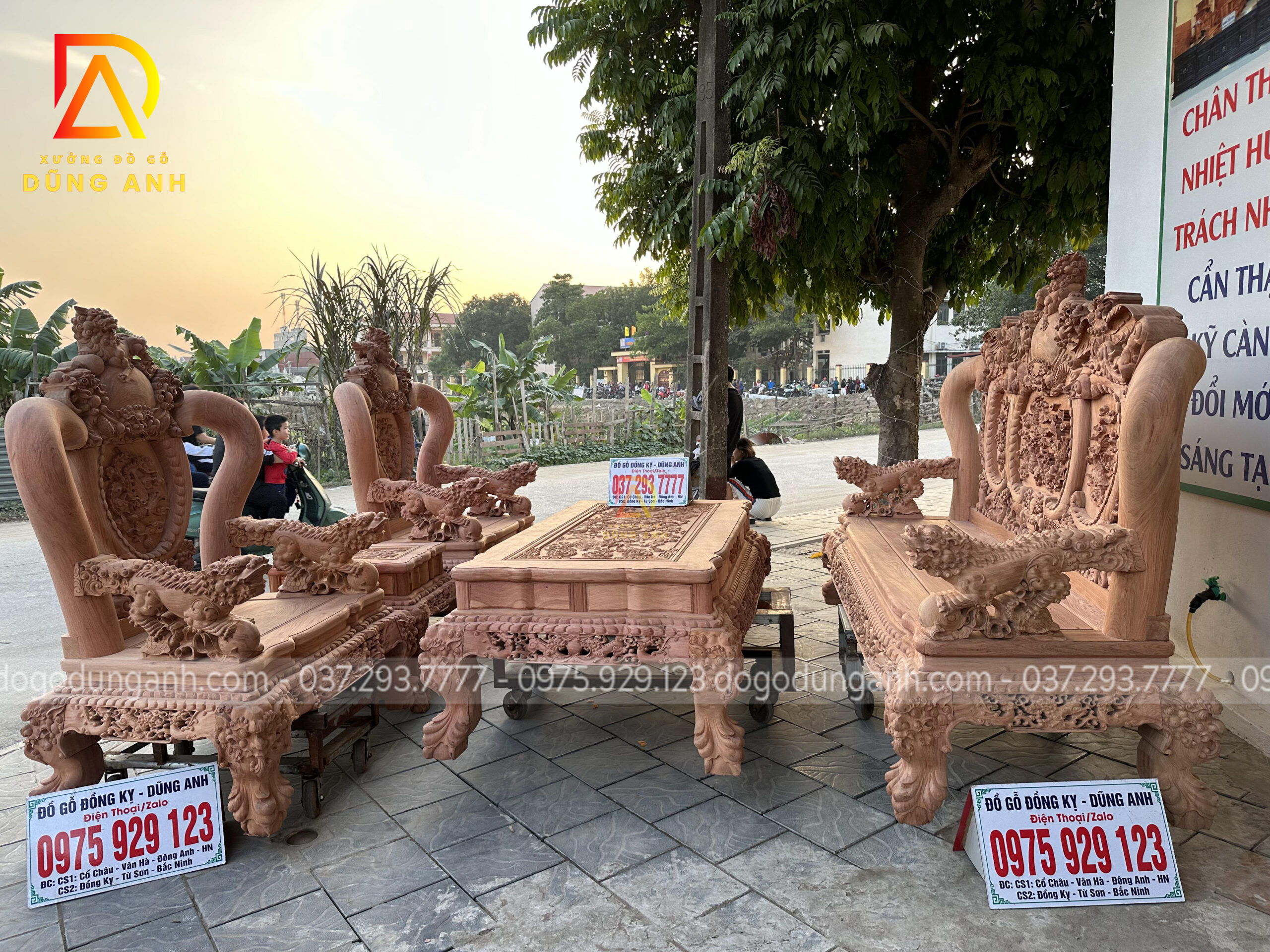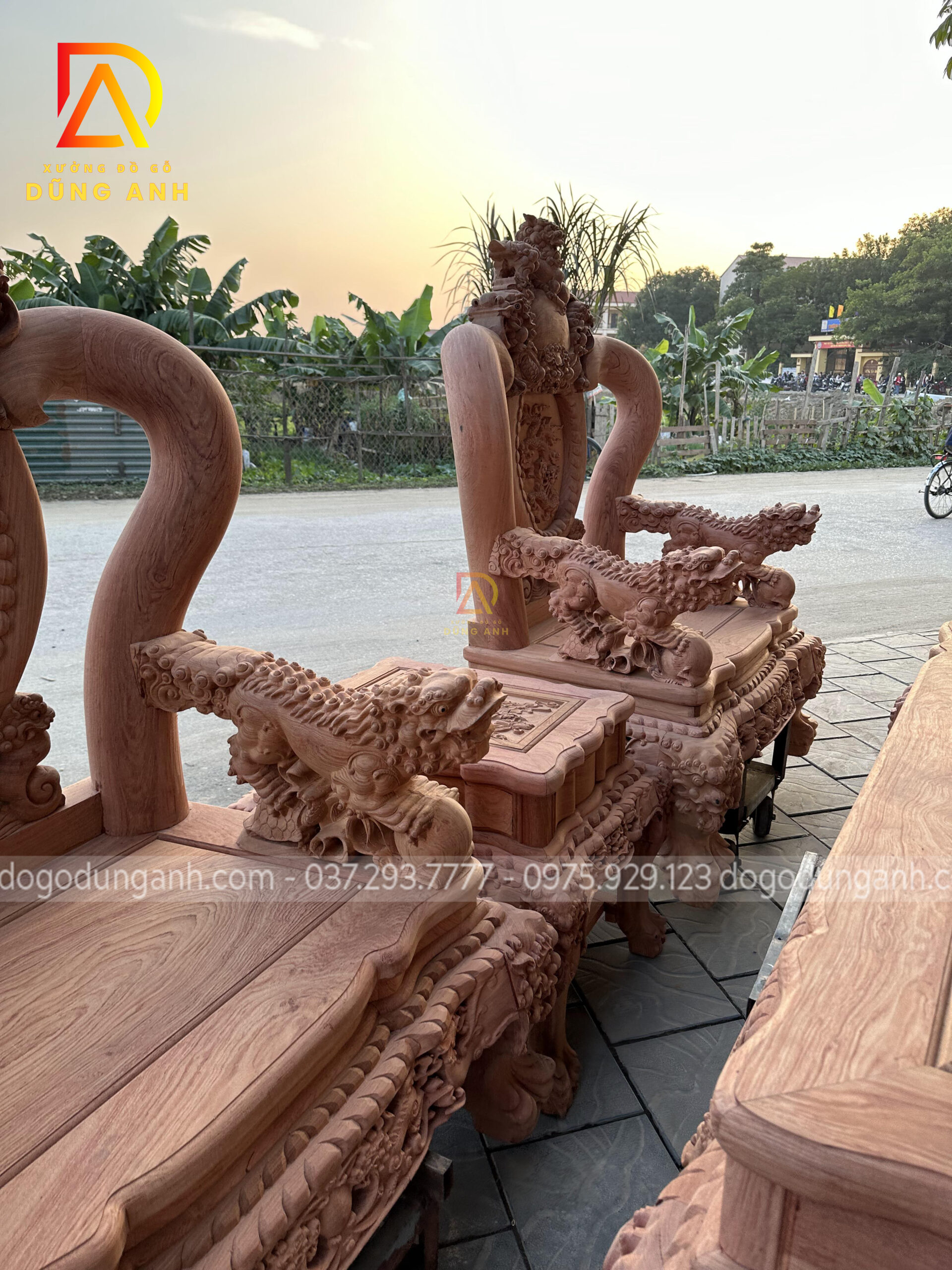 Bộ bàn ghế anh Bắc chọn thuộc mẫu minh quốc nghê bảo đỉnh đặt theo yêu cầu tay 15 hàng đại từ chất liệu gỗ hương đá cao cấp gồm 6 món với kích thước hoành tráng và nổi bật. Đã được xưởng Đồ Gỗ Dũng Anh sản xuất nhanh chóng và đang đợi phun sơn hoàn thiện để có thể về với không gian phòng khách nhà anh Bắc tại Hải Phòng.