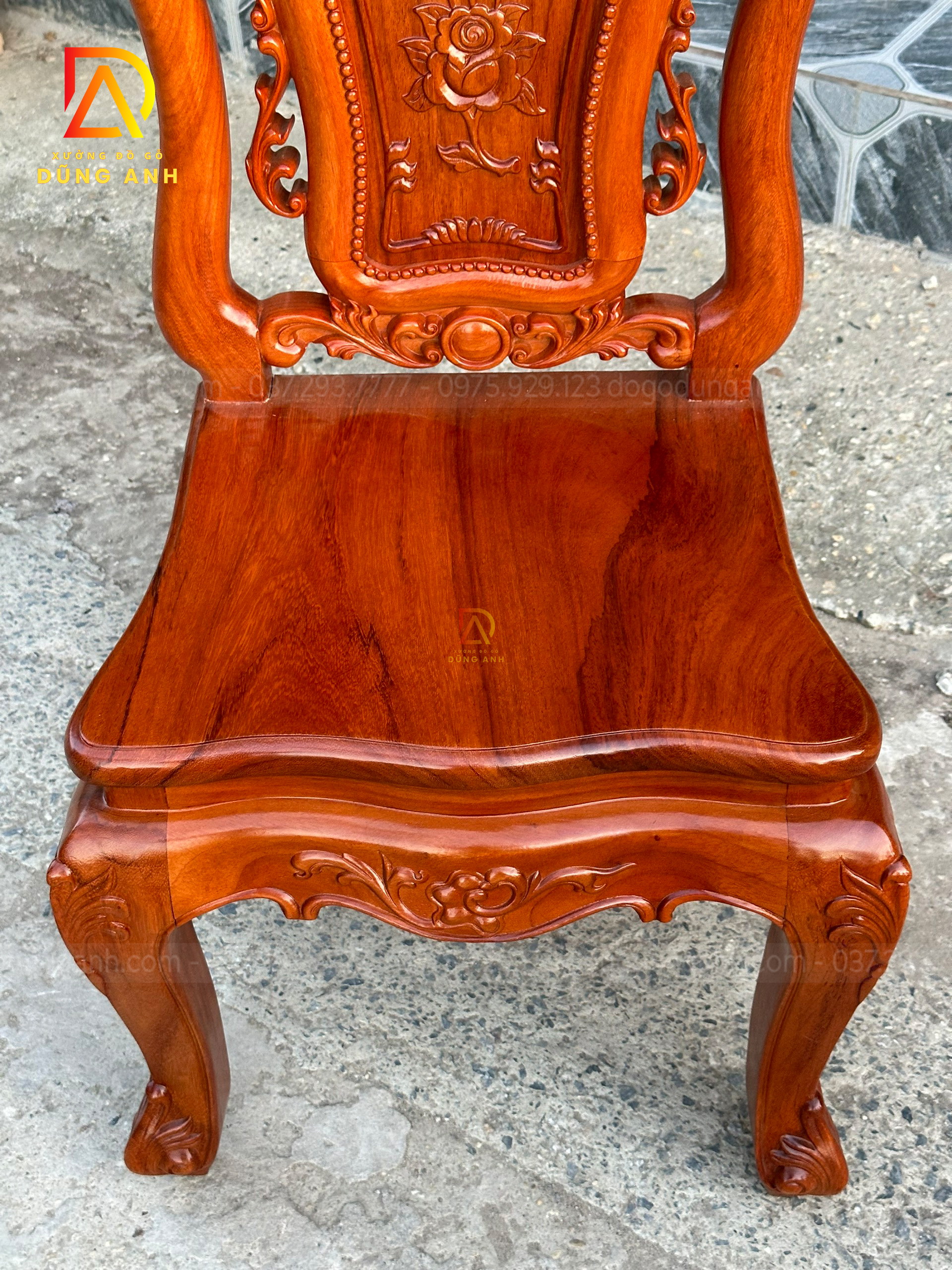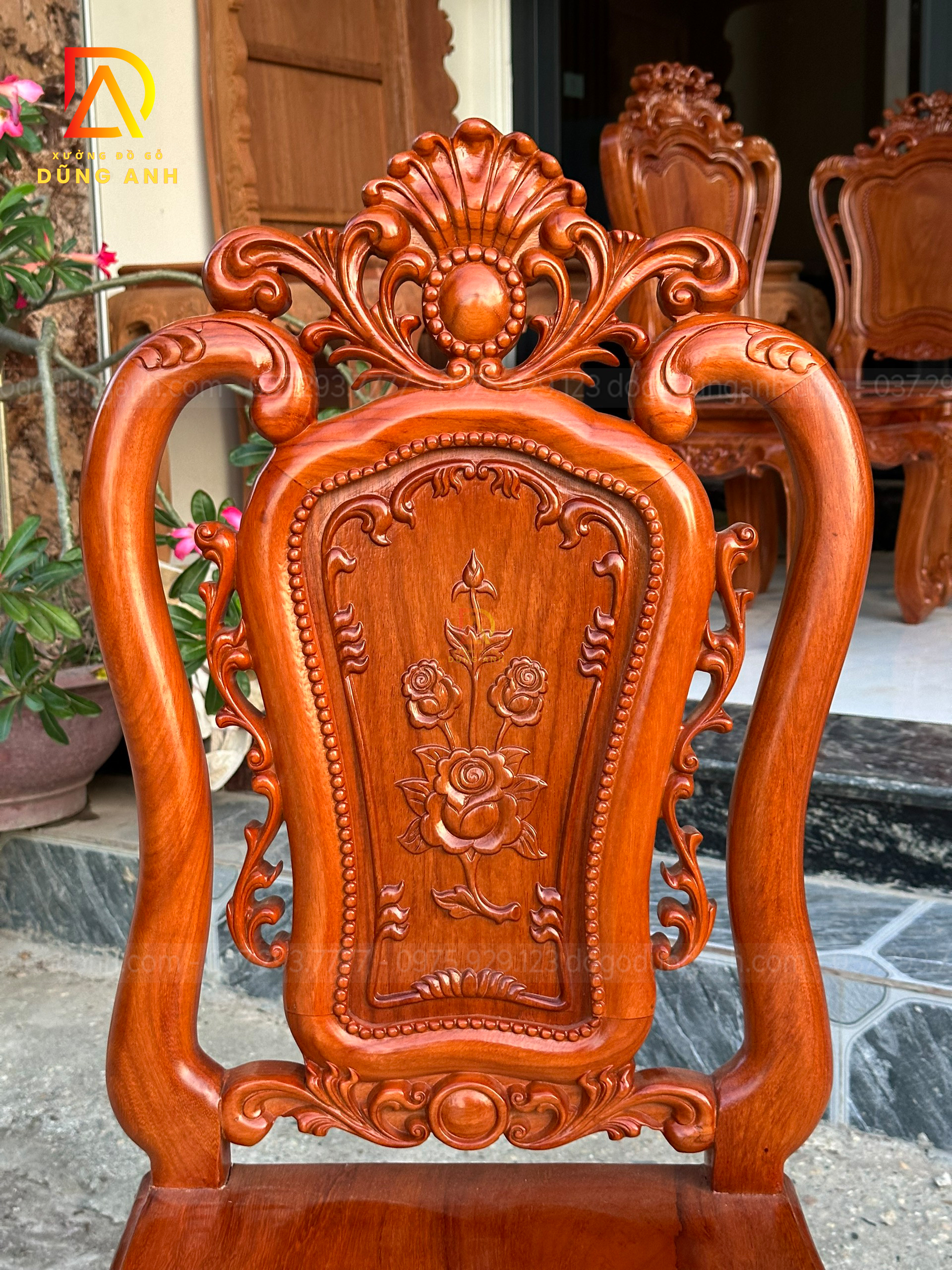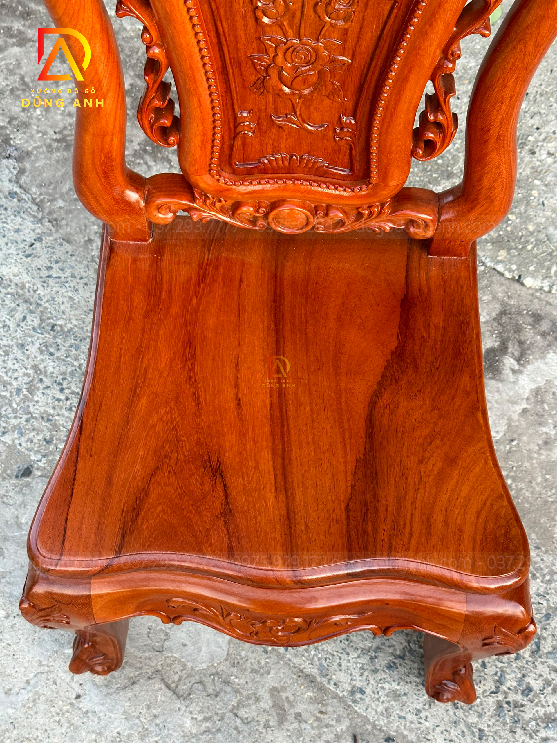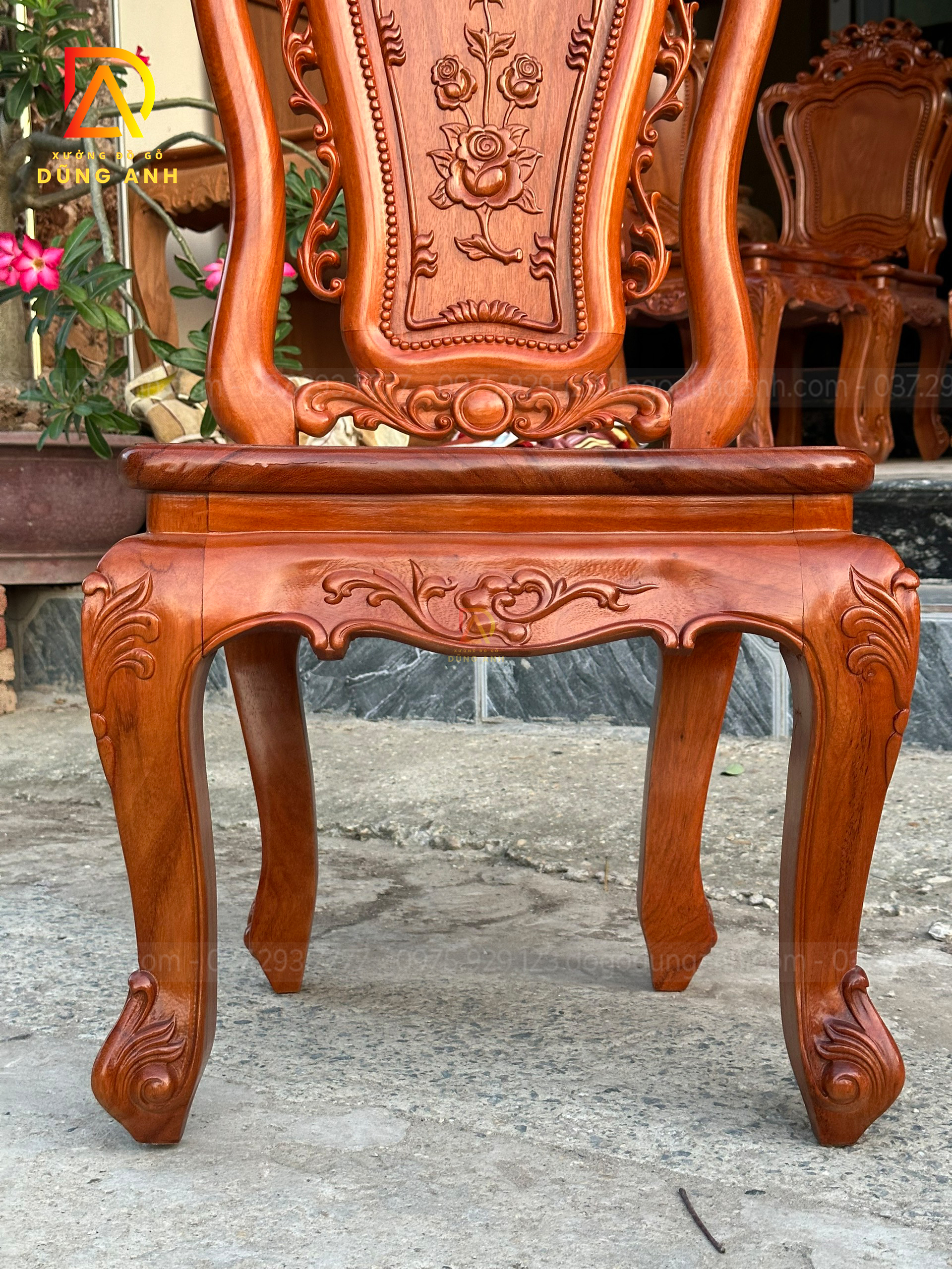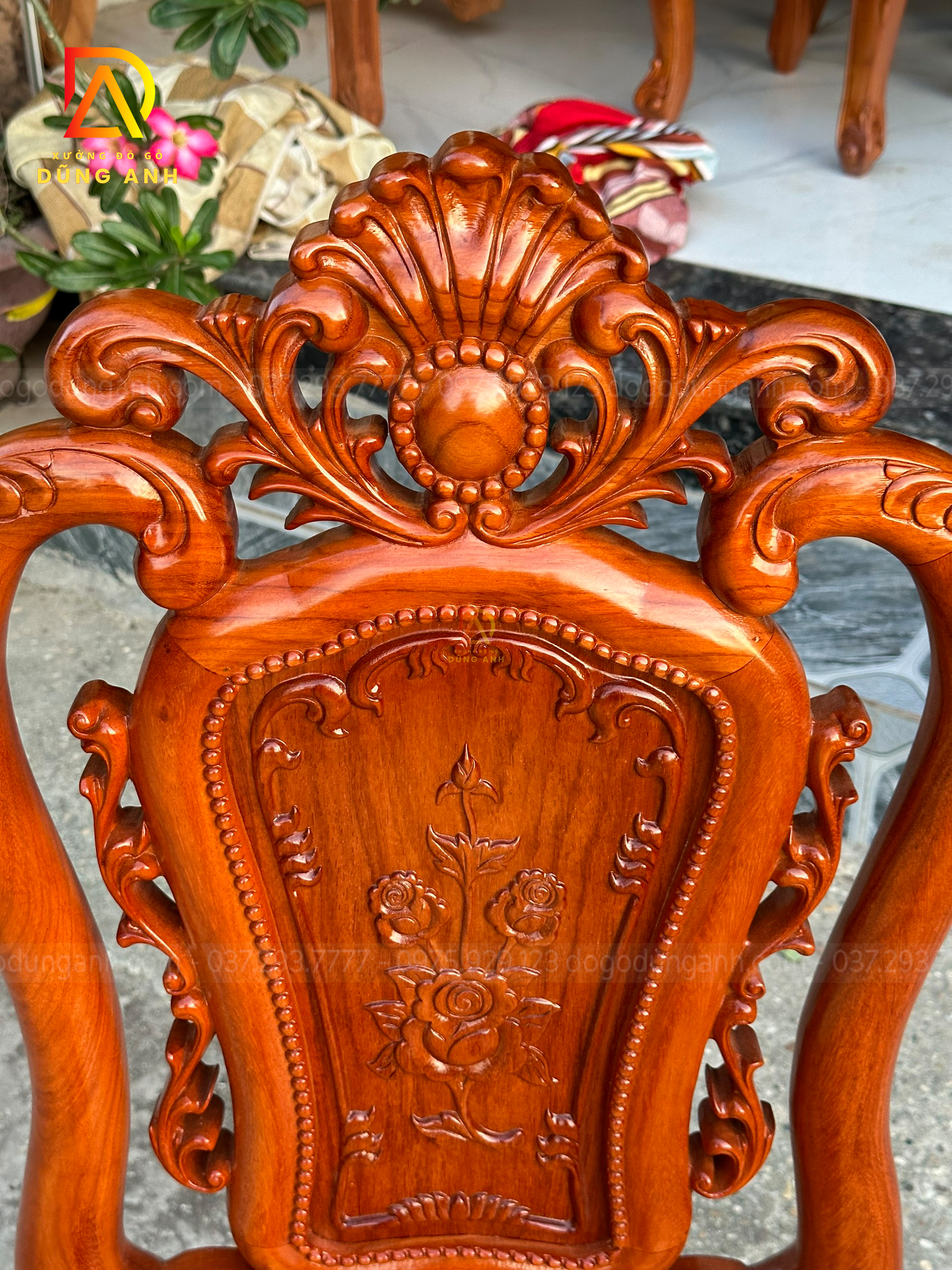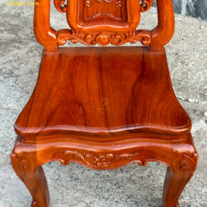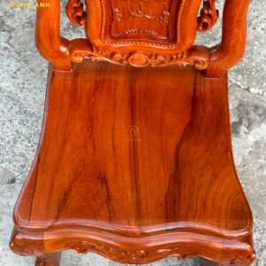 - Phần Chương ghế Liền Nguyên Khối được đục chính giữa là cành hoa hồng xung quanh là họa tiết hoa lá tây vô cùng sắc nét phía dưới