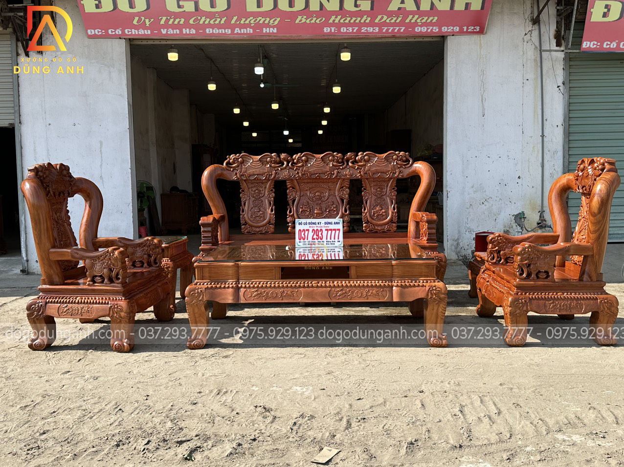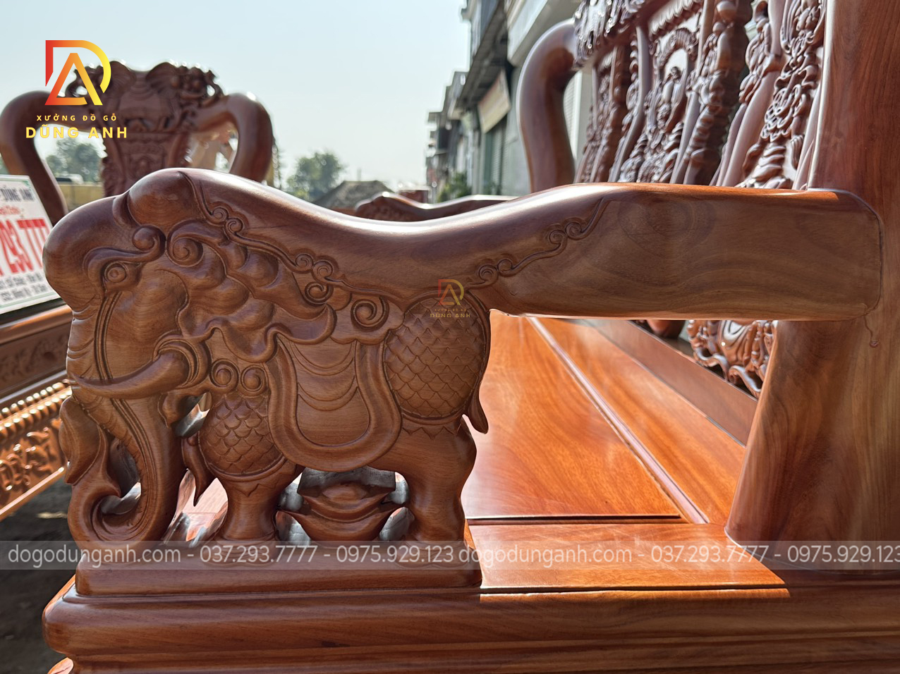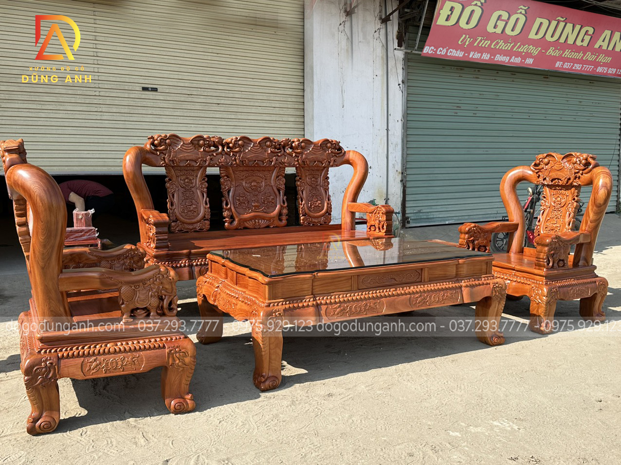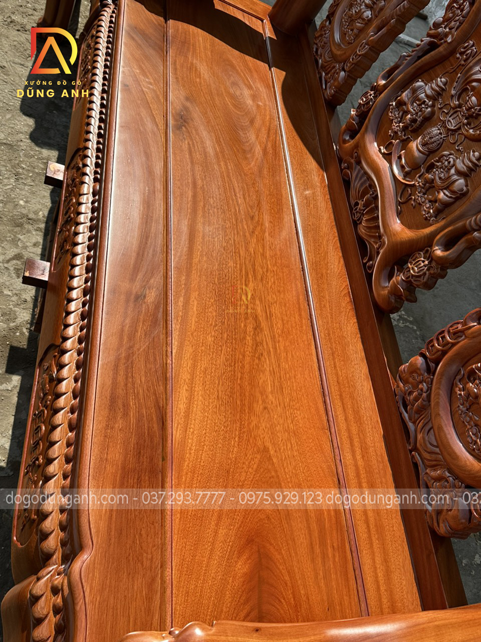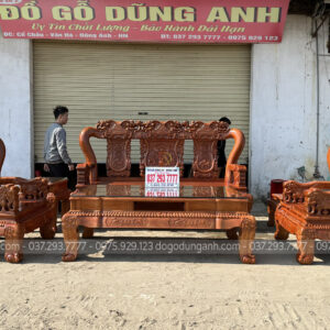 Bộ sản phẩm Xưởng đồ gỗ Dũng Anh bên em chế tác hoàn toàn từ 100% chất liệu gỗ gõ đỏ dòng gỗ cao cấp chất lượng với giá thành khá đắt đỏ. Được xưởng chọn lọc kỹ càng nên đảm bảo độ đanh chắc hoàn hảo để tạo nên các họa tiết đục tinh xảo, nổi bật theo phong cách louis hoàng gia tân cổ điển vô cùng sang trọng và bắt mắt.