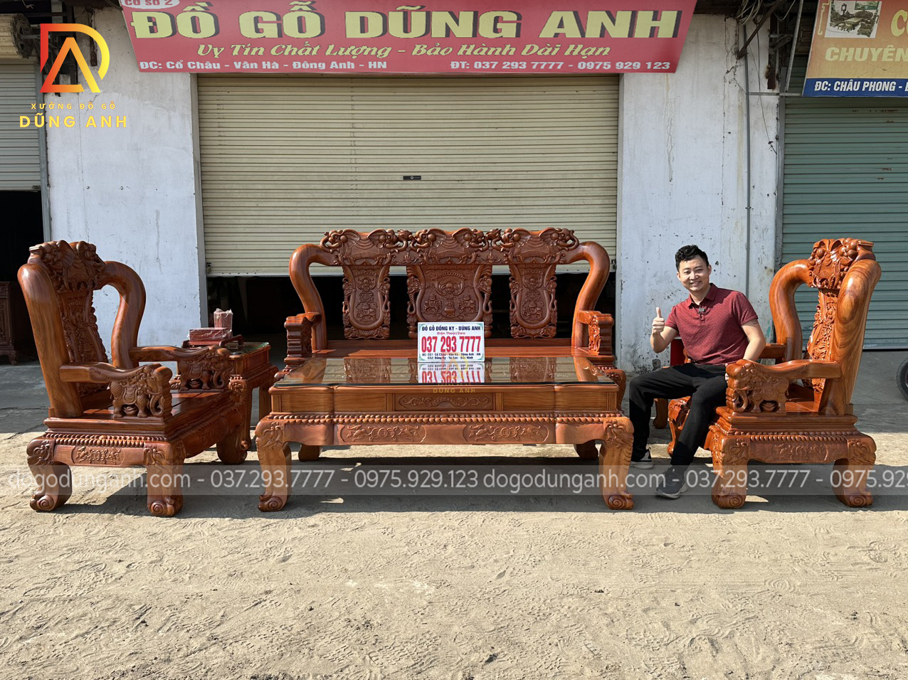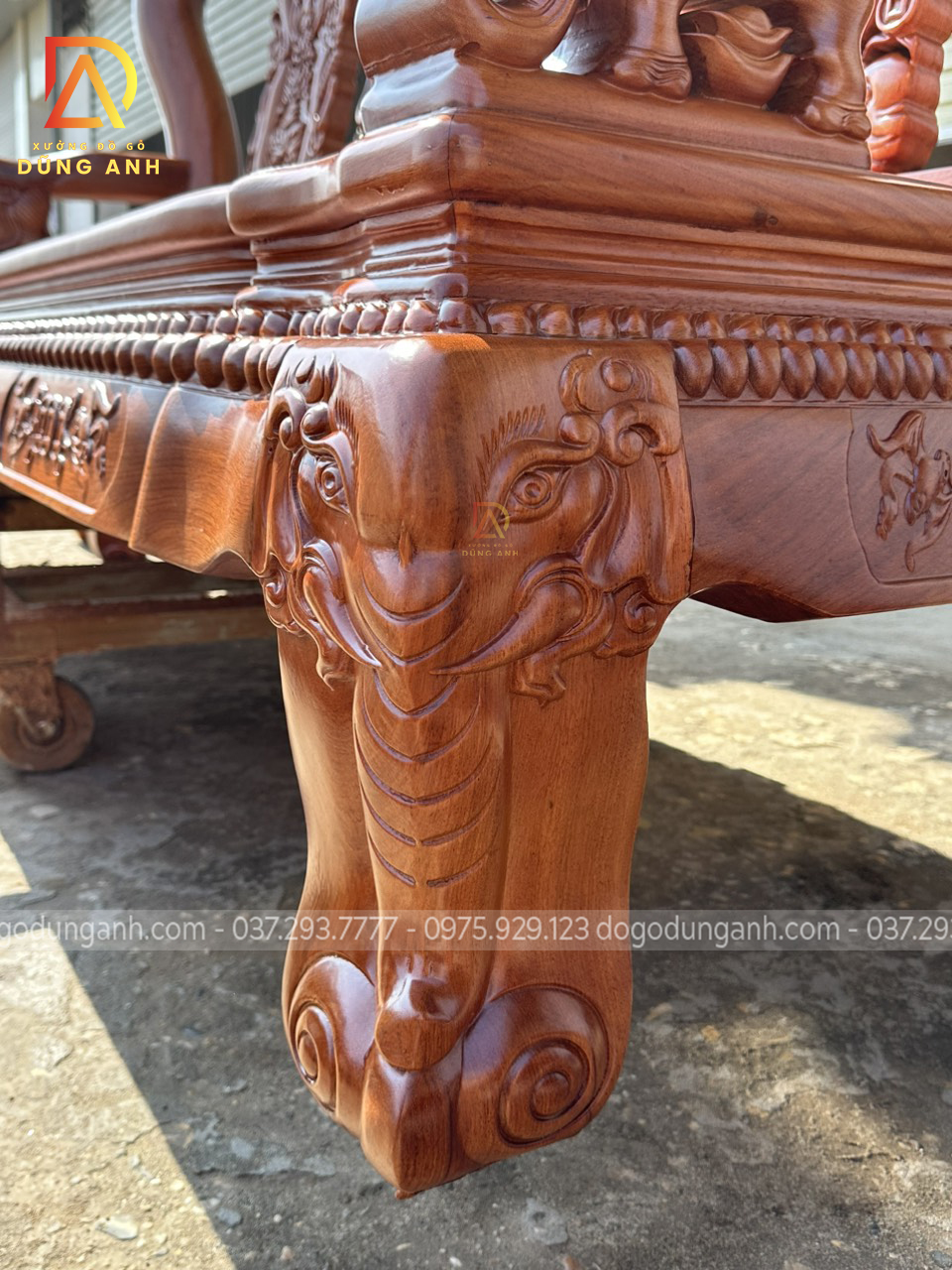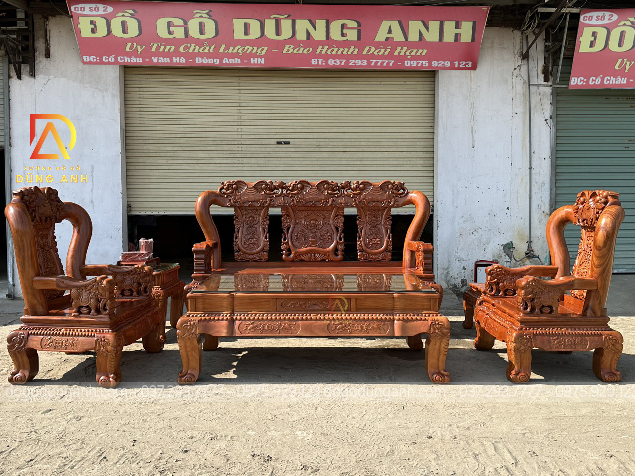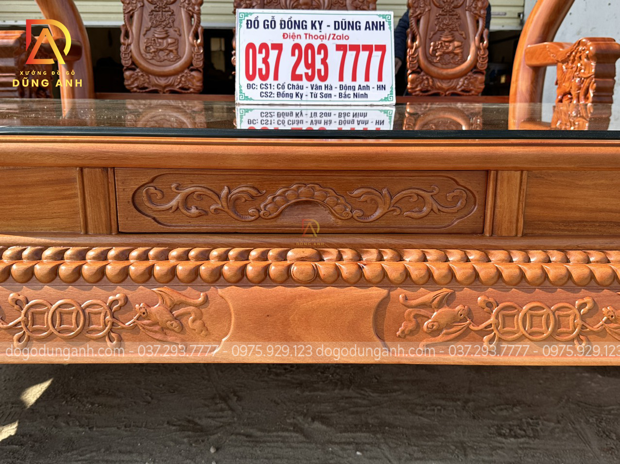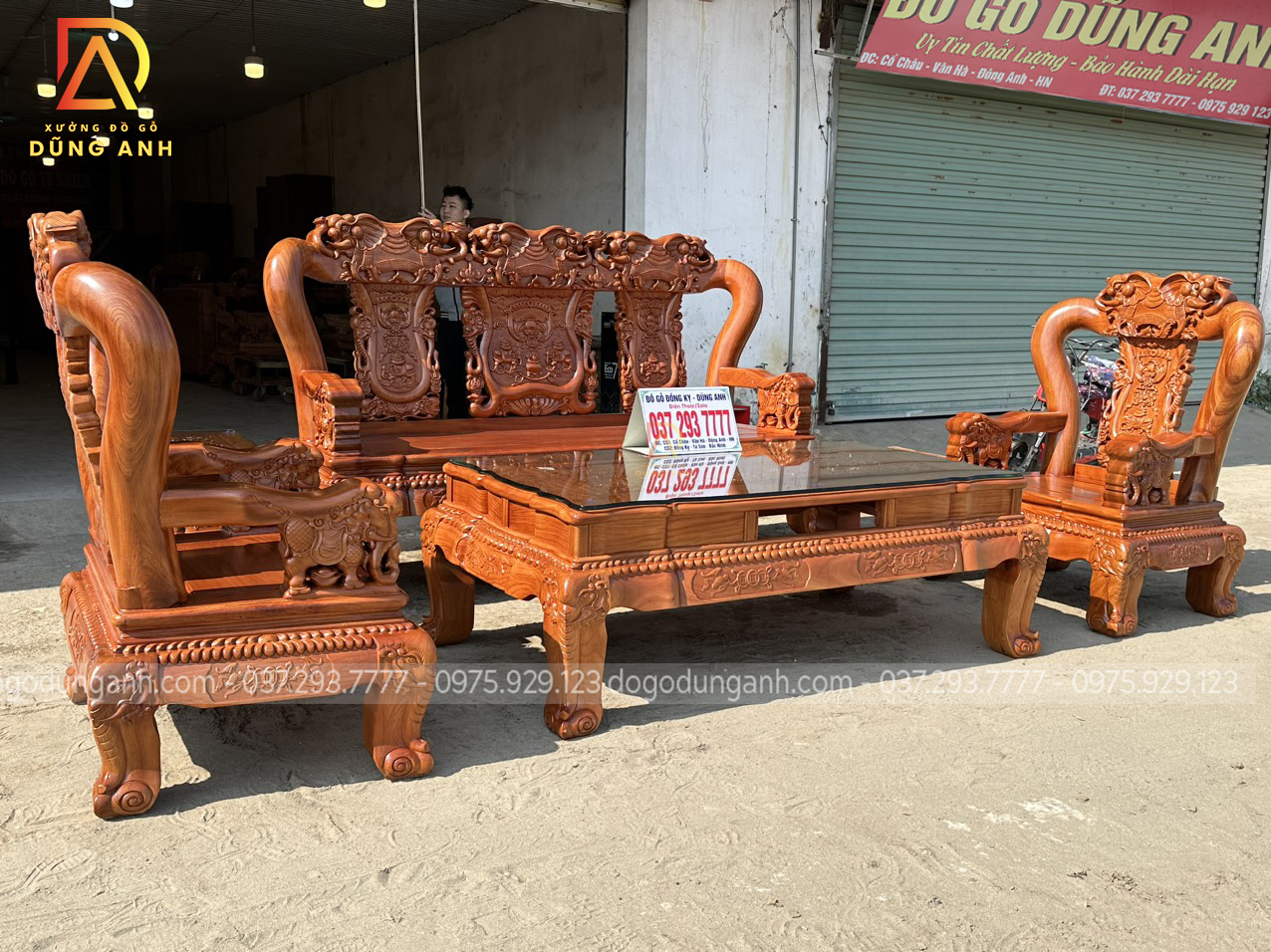 Bộ sản phẩm Xưởng đồ gỗ Dũng Anh bên em chế tác hoàn toàn từ 100% chất liệu gỗ gõ đỏ dòng gỗ cao cấp chất lượng với giá thành khá đắt đỏ. Được xưởng chọn lọc kỹ càng nên đảm bảo độ đanh chắc hoàn hảo để tạo nên các họa tiết đục tinh xảo, nổi bật theo phong cách louis hoàng gia tân cổ điển vô cùng sang trọng và bắt mắt.