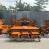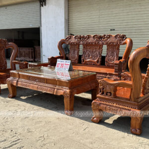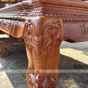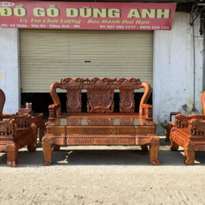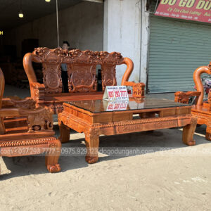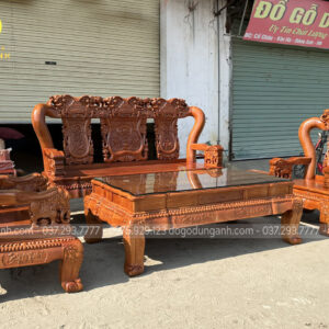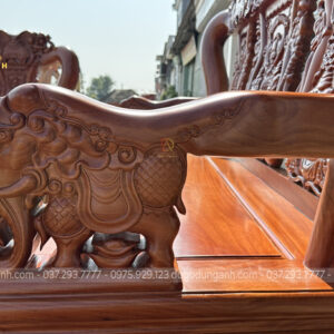Mẫu bàn ghế minh quốc nghê gỗ hương đá 6 món cột 14 chân 15 là một trong những mẫu bàn ghế gỗ phòng khách bán chạy nhất của Xưởng đồ gỗ Dũng Anh trong hai năm trở lại đây. Bộ bàn ghế đặc trưng bởi nhiều họa tiết tứ linh đục chạm thủ công mỹ nghệ bằng tay kênh bong sắc nét bời những người thợ tài hoa. Từng đường nét đều toát lên sự cần mẫn tỉ mỹ của người nghệ nhân có kinh nghiệm lâu năm.