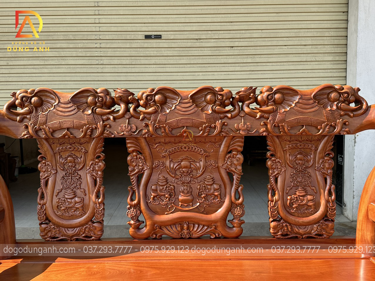 Phần chương ghế được đục Voi chiến với phong thái mạnh mẽ, điểm nhấn xung quanh là những hũ tiền tài lộc lá không chỉ mang ý nghĩa xua đuổi những điều xấu tác động tiêu cực đến cho gia chủ mà còn đem lại sự may mắn, thịnh vượng.