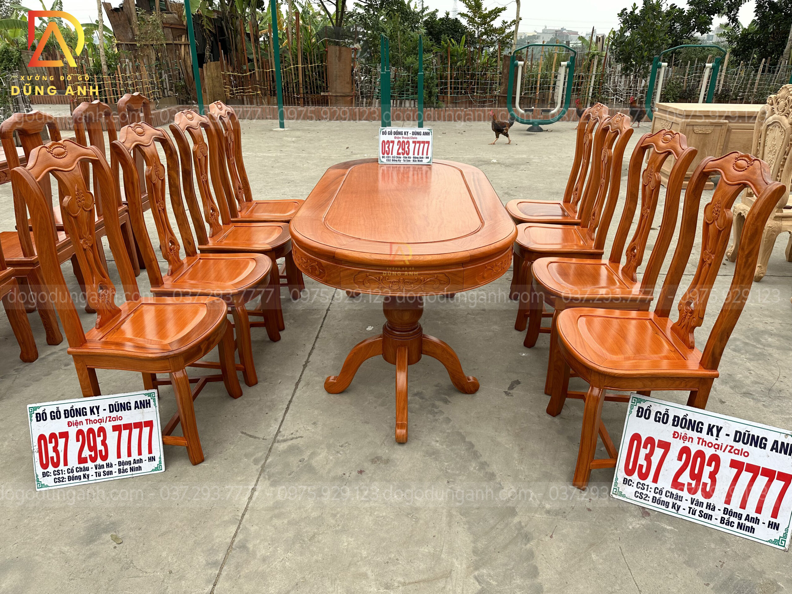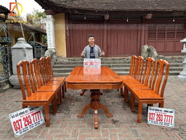 Bộ sản phẩm bàn bầu dục vén góc kết hợp với tám ghế mẫu cây đàn vách cong chữ S từ gỗ Gõ Đỏ là một tác phẩm nghệ thuật vô cùng đẳng cấp và sang trọng, kết hợp sự tinh tế của thiết kế và vẻ đẹp tự nhiên của gỗ.