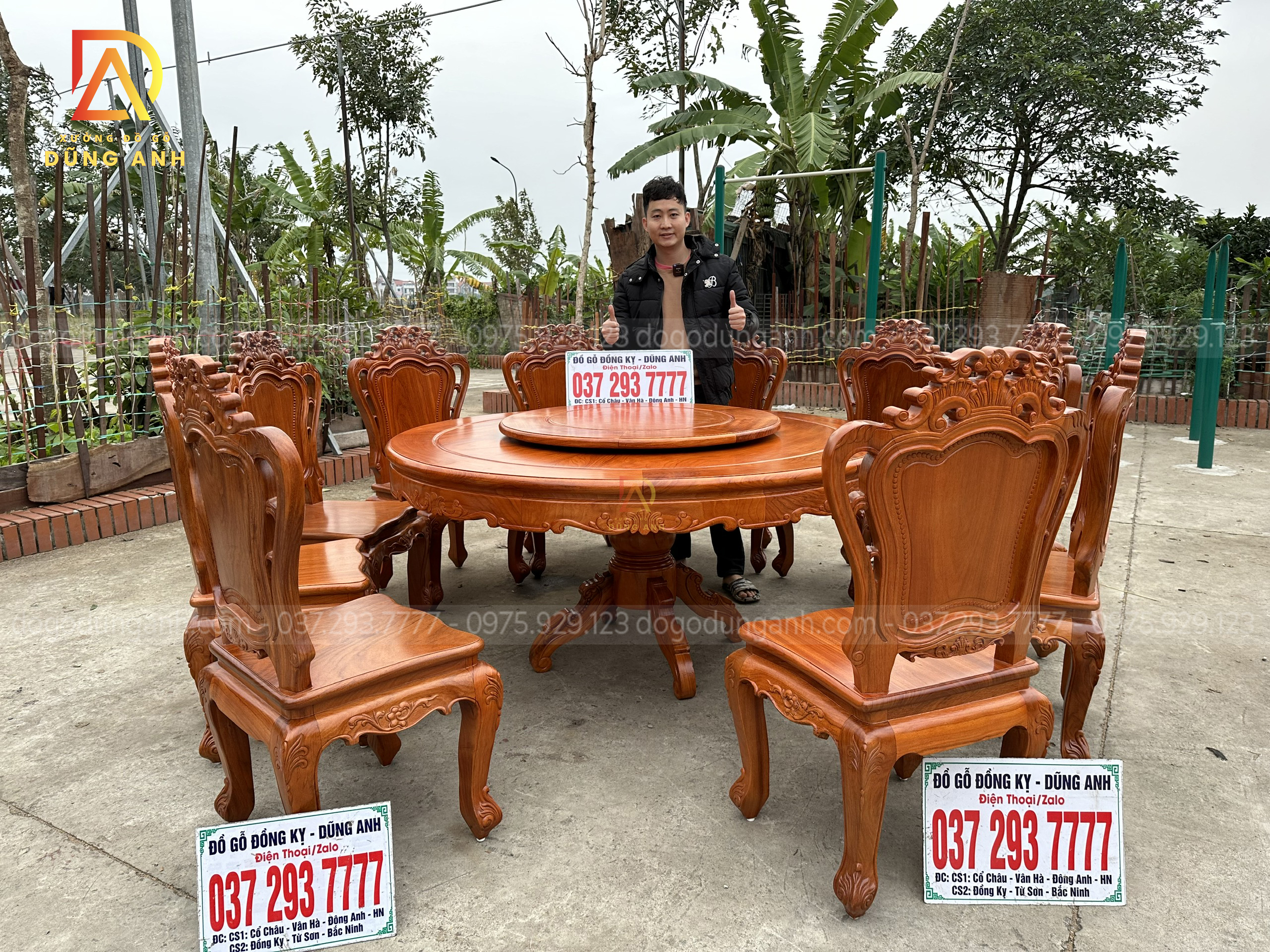 Sản phẩm 8 ghế Tần Thủy Hoàng kết hợp bàn tròn đục tiểu cảnh và mâm xoay – gỗ Hương Đá