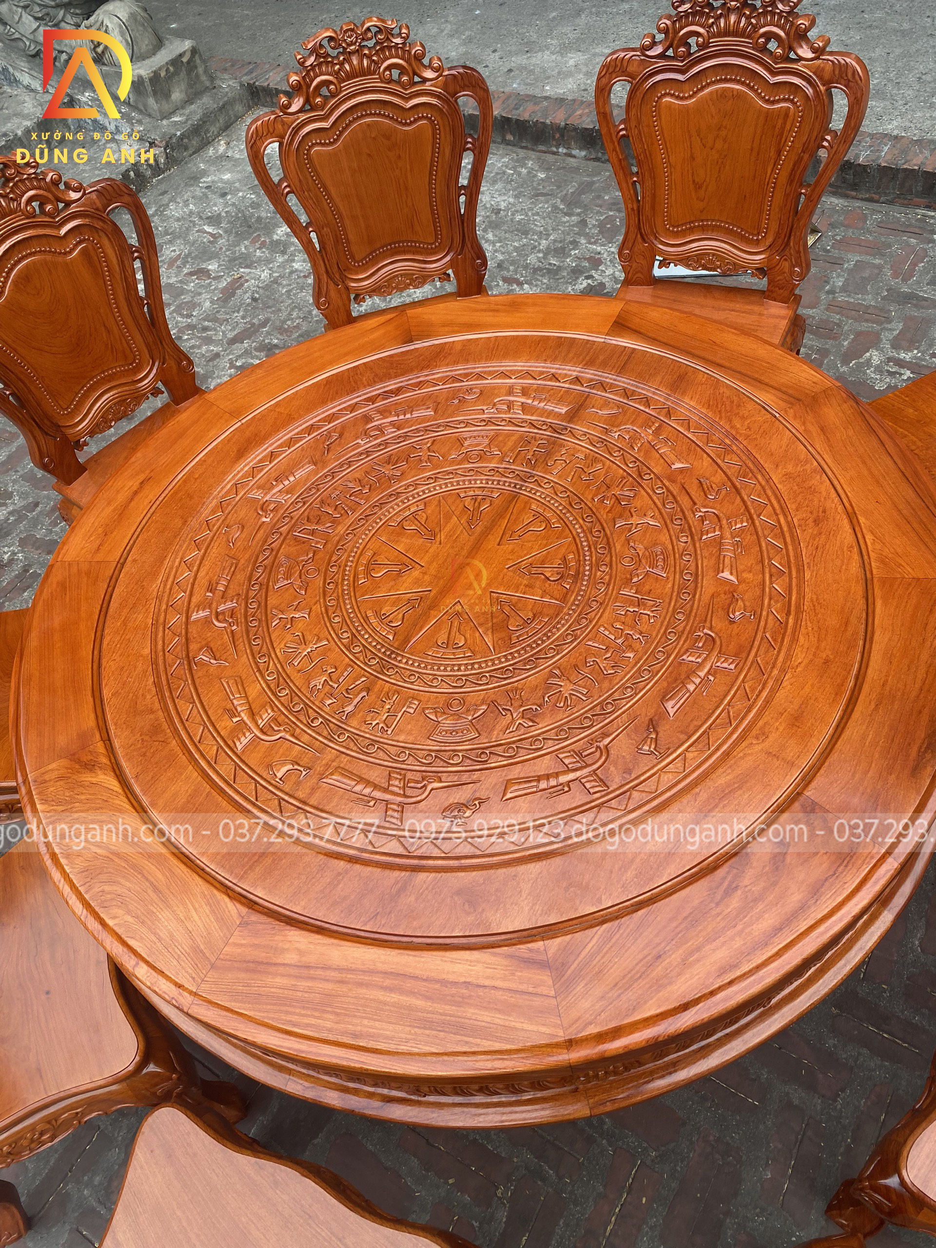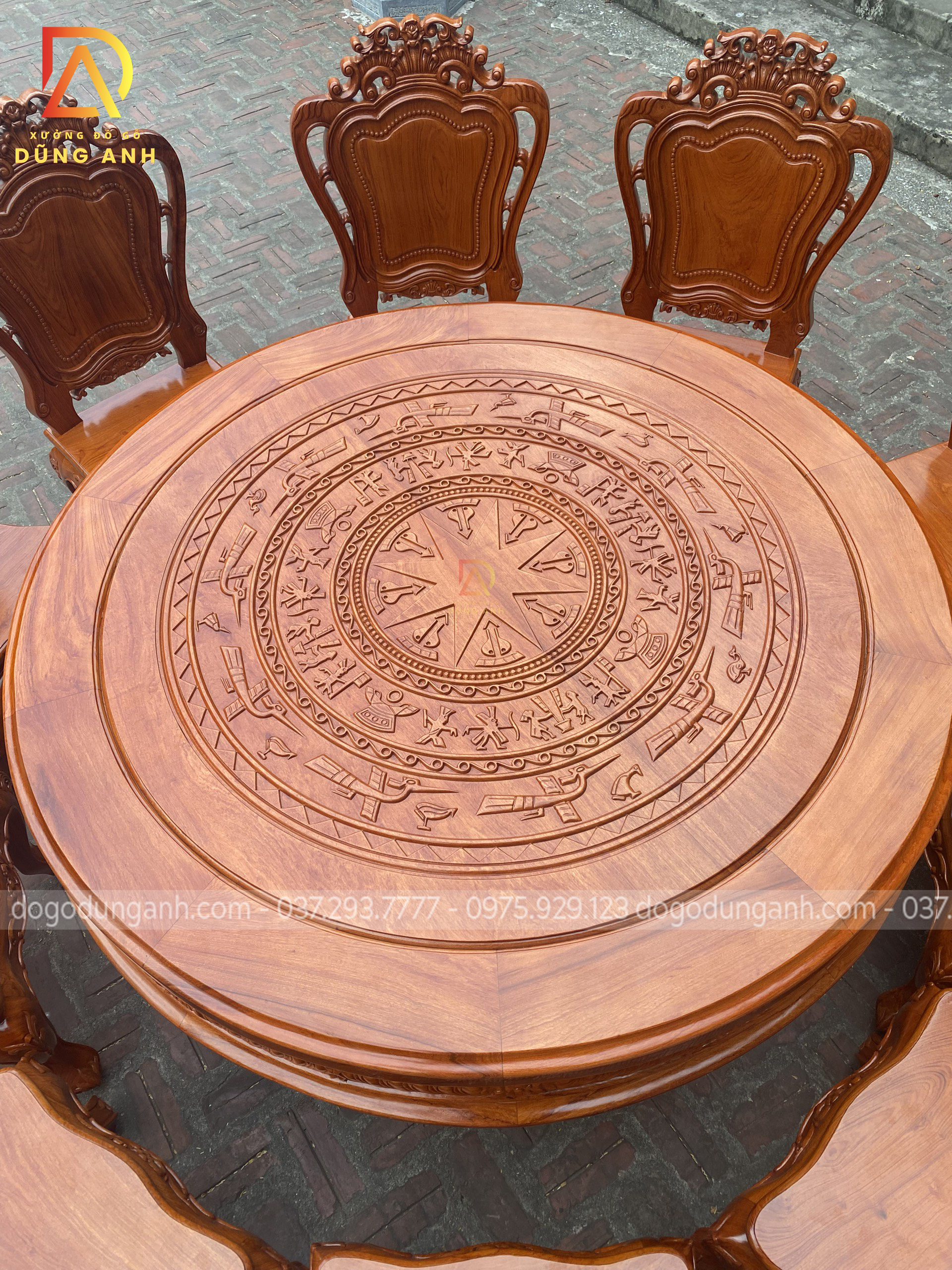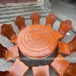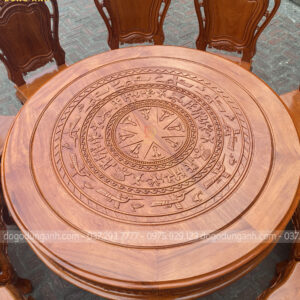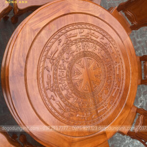 - Mặt bàn được đục trạm trổ họa tiết Trống Đồng Đông Sơn cực dân dã mang lại phong cách truyền thống cổ truyền làm tăng sự cổ kính của không gian ngôi nhà