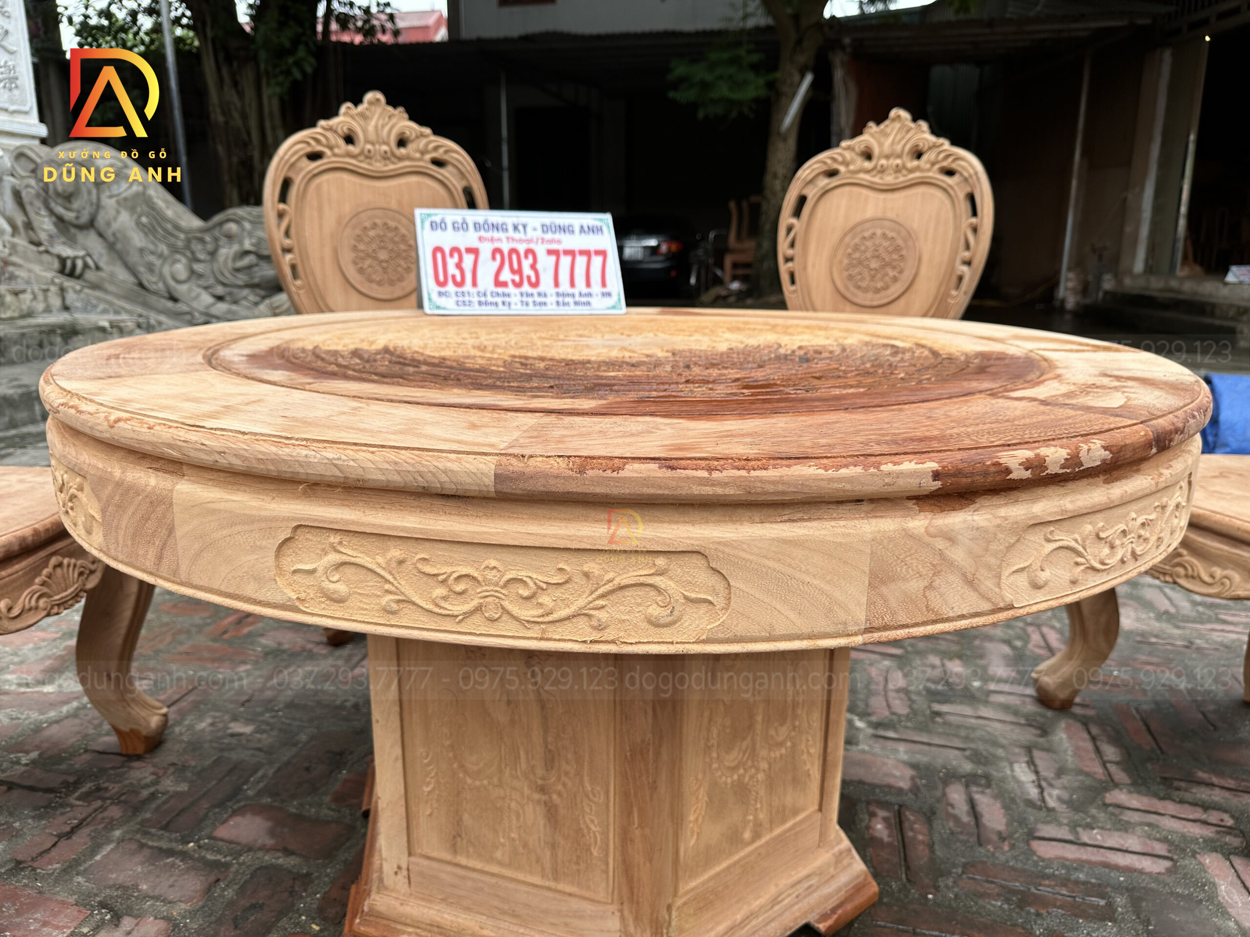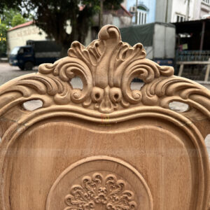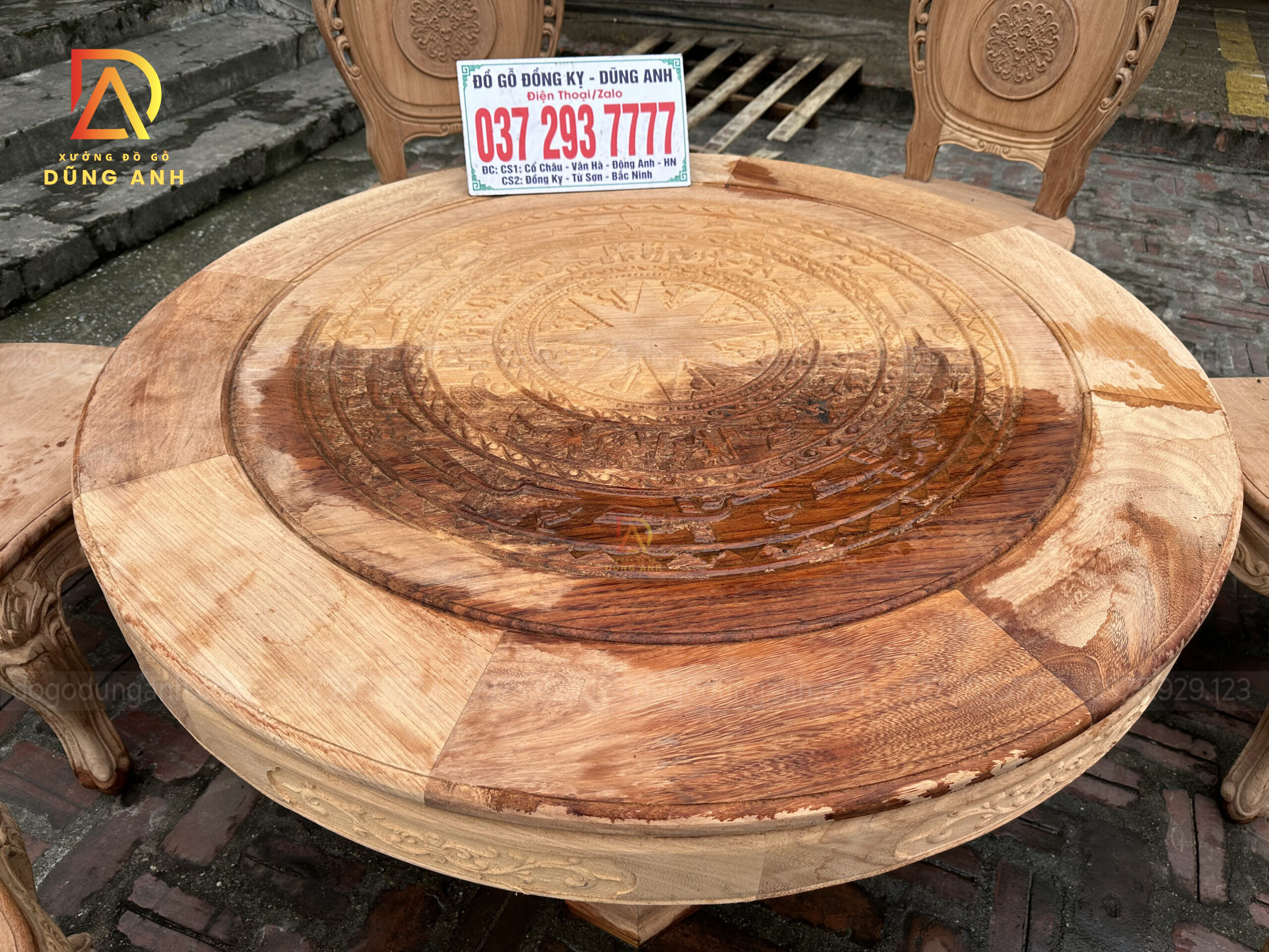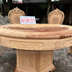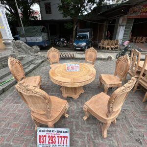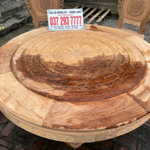 - Chiếc bàn có đường kính 130cm kích thước cực kì phù hợp với mẫu ghế Louis Hoàng Gia , mặt bàn được ghép từ 2 lá dày 2cm đục trạm họa tiết Trống Đồng Đông Sơn nổi bật