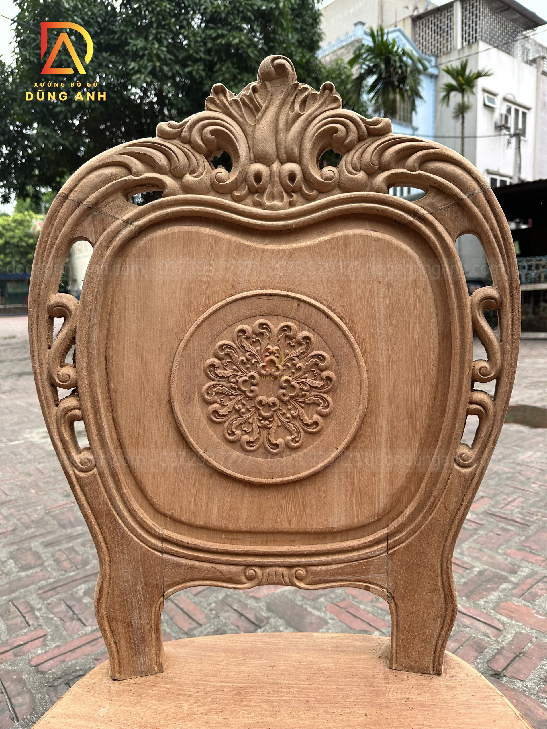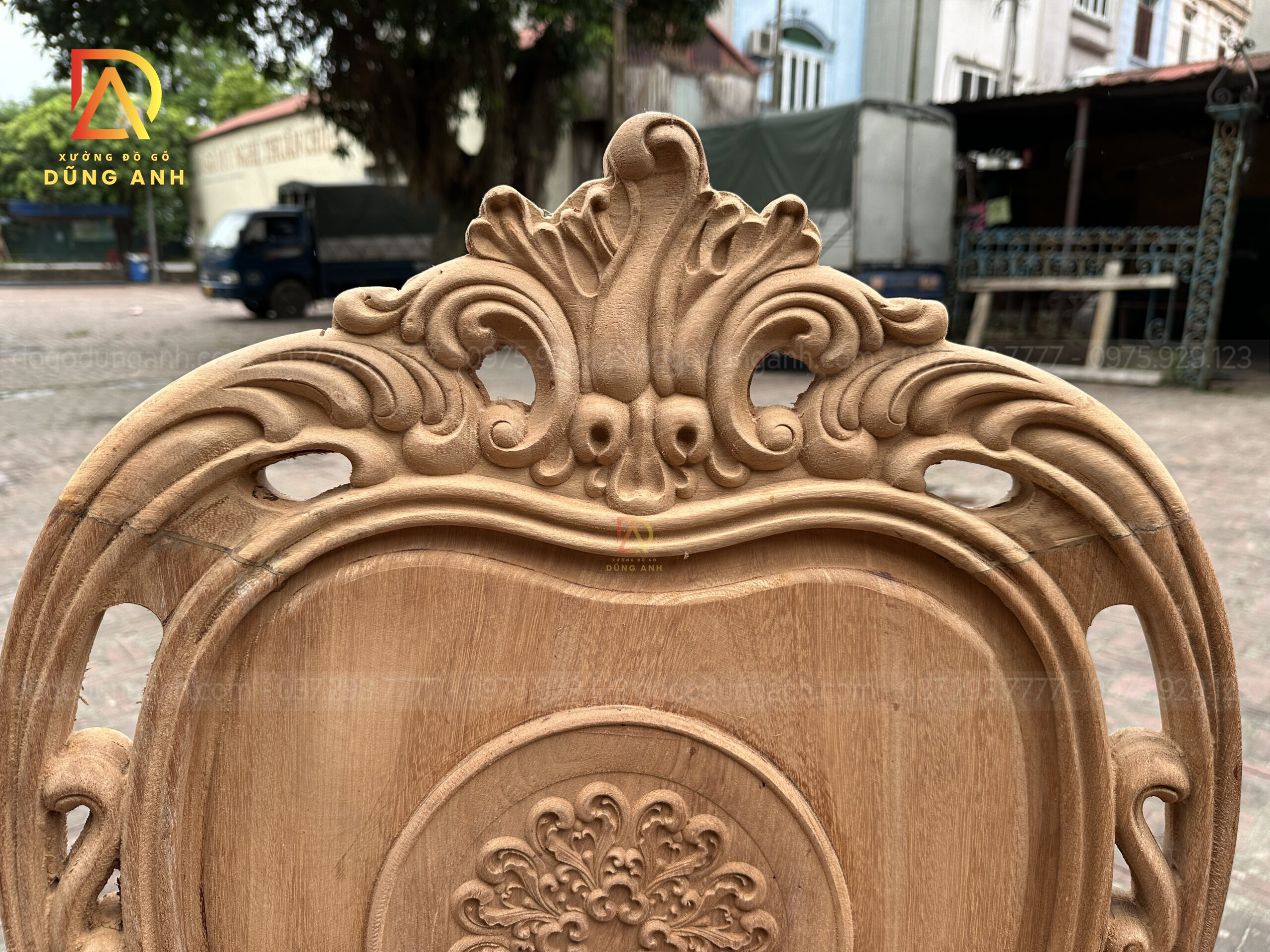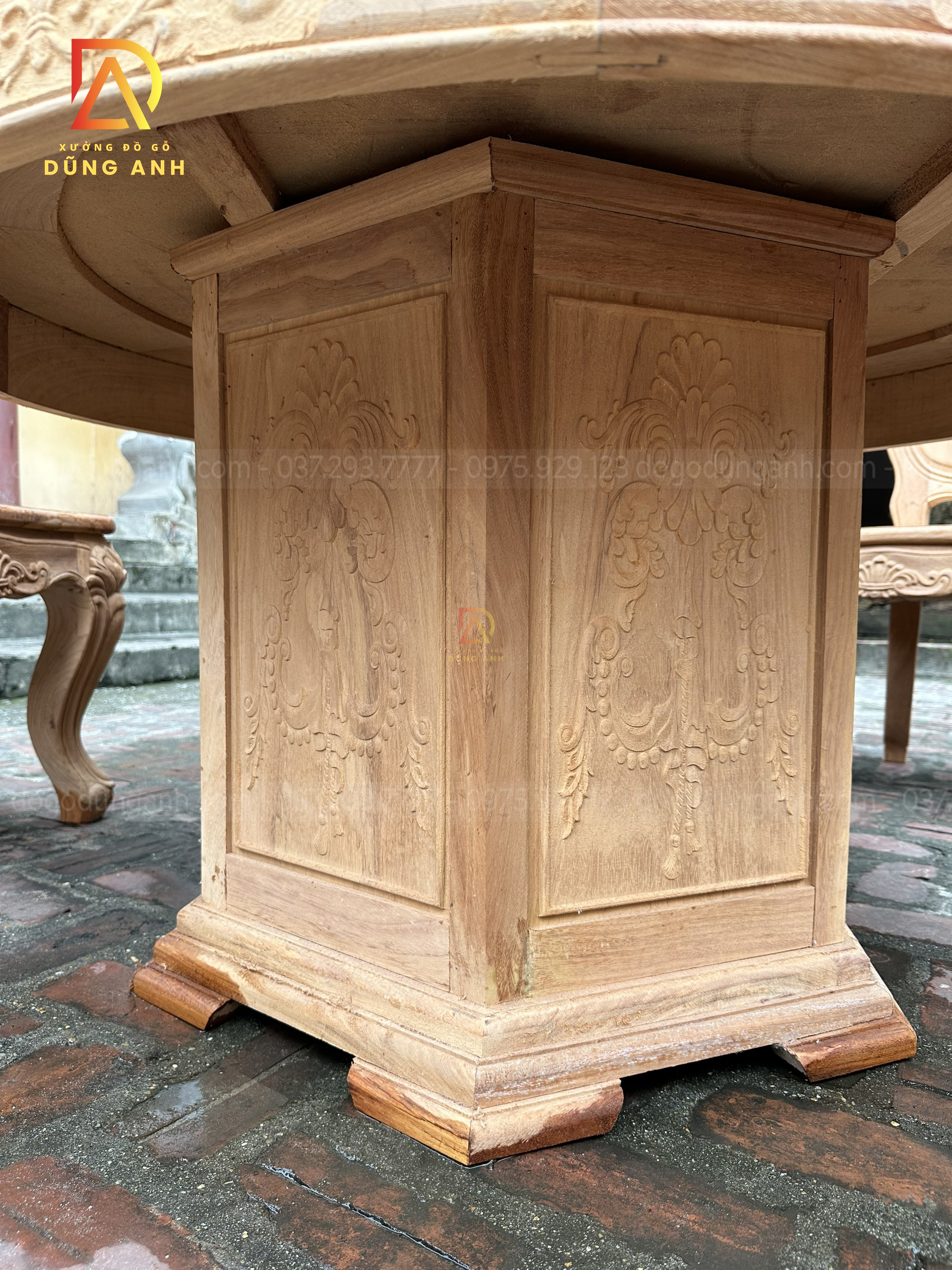 - Chiếc bàn có đường kính 130cm kích thước cực kì phù hợp với mẫu ghế Louis Hoàng Gia , mặt bàn được ghép từ 2 lá dày 2cm đục trạm họa tiết Trống Đồng Đông Sơn nổi bật