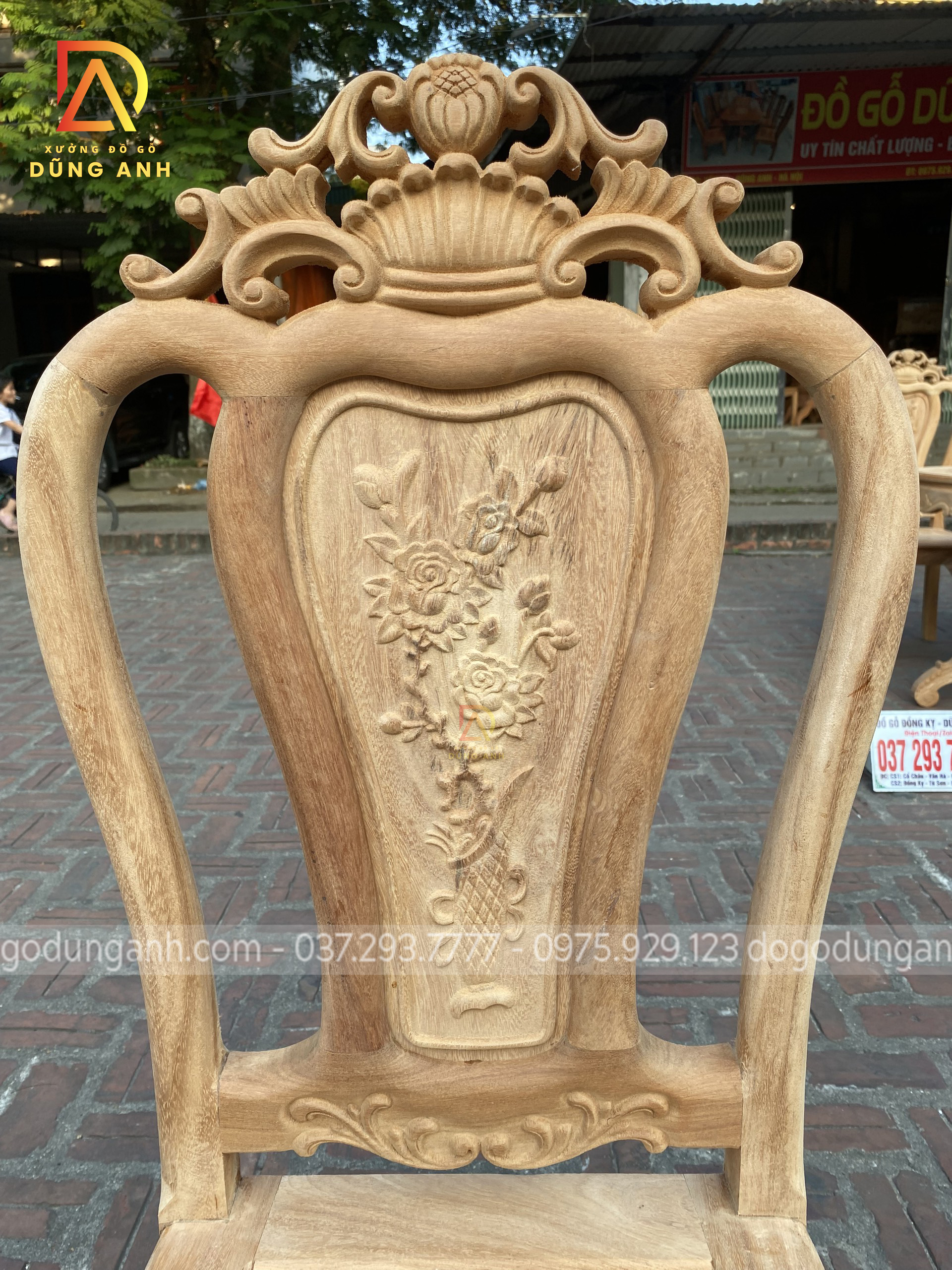 - Chân ghế được đục hình hoa lá tây vén ngựa uốn cong, sở hữu dáng dấp vừa hài hòa vừa mạnh mẽ
