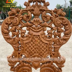 - Ghế có sở hữu một chiếc chương với lối thiết kế đục trạm hoa lá tây cùng với vương miện giả luxury theo thiết kế hoàng gia Pháp kết hợp với bản tựa điêu khác caro đảm bảo sẽ làm mọi người ưng ý