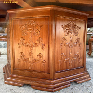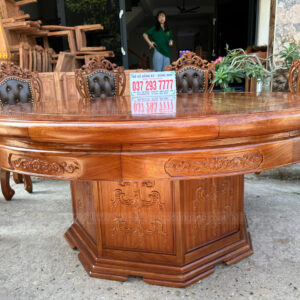 Điểm nhấn của bộ sản phẩm chính là bàn tròn ván lồng khung, được thiết kế với kích thước lớn, hoàn hảo cho các buổi tiệc hay tiếp khách đông người. Bàn được làm từ gỗ gõ đỏ nguyên khối, với bề mặt bóng mịn, đem lại cảm giác tự nhiên và sang trọng. Khung bàn được gia công chắc chắn, với các chi tiết chạm khắc tinh xảo tương tự như ghế, tạo nên sự đồng bộ và hài hòa trong thiết kế.