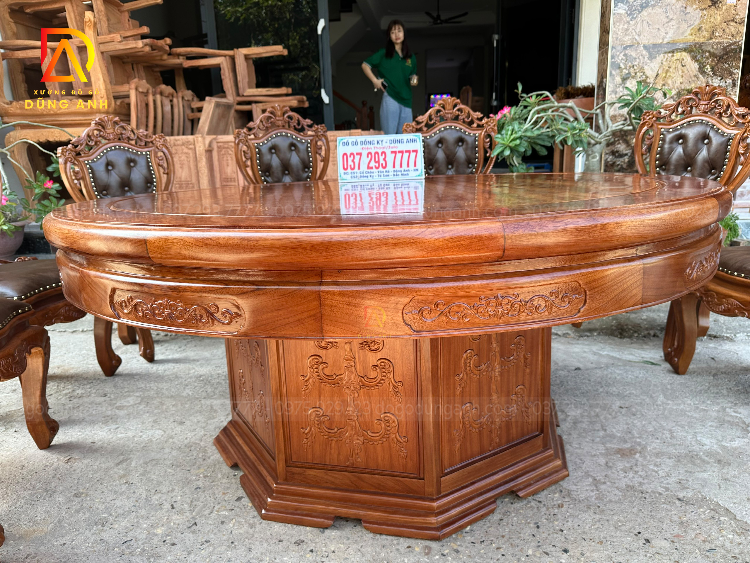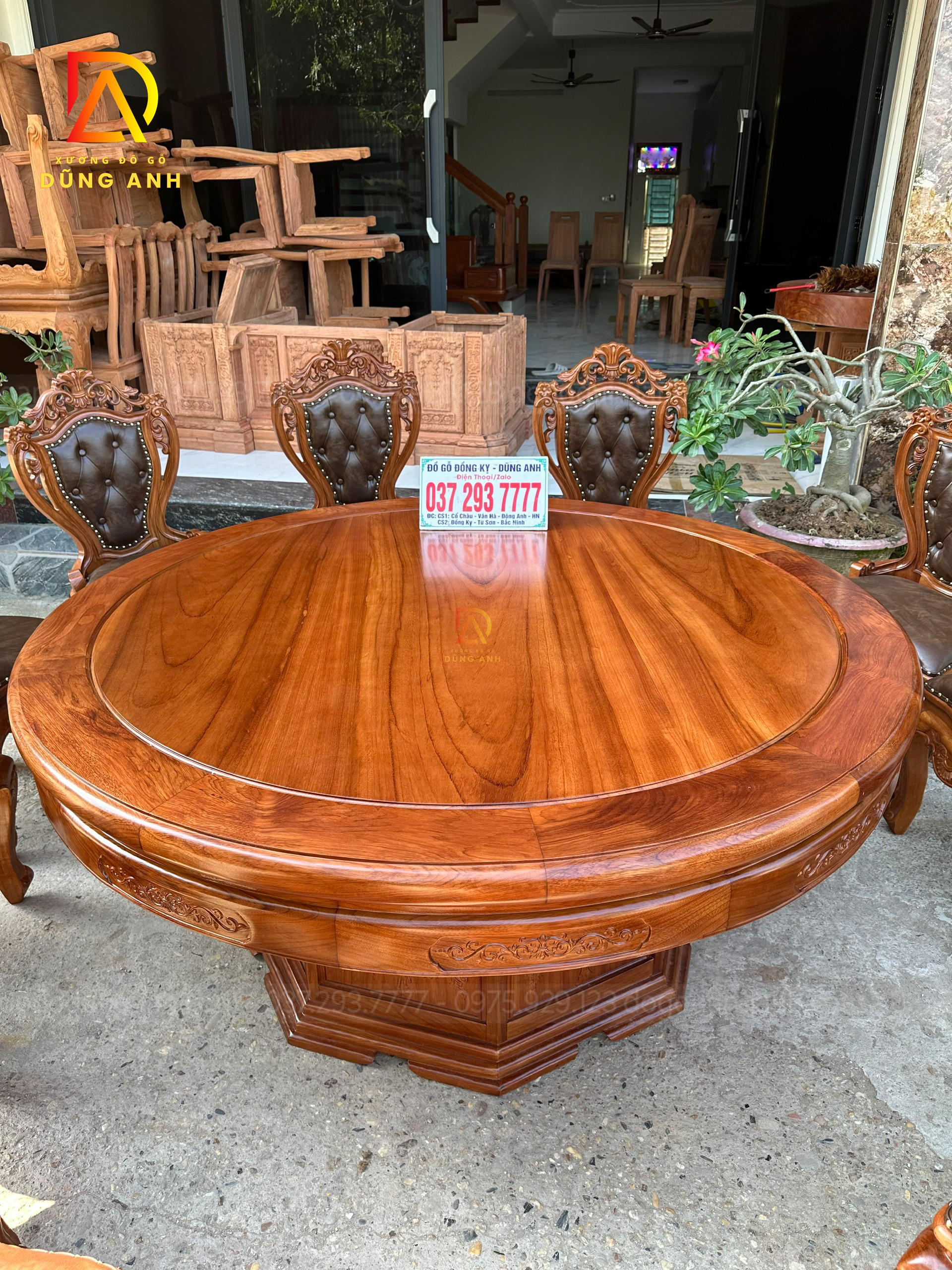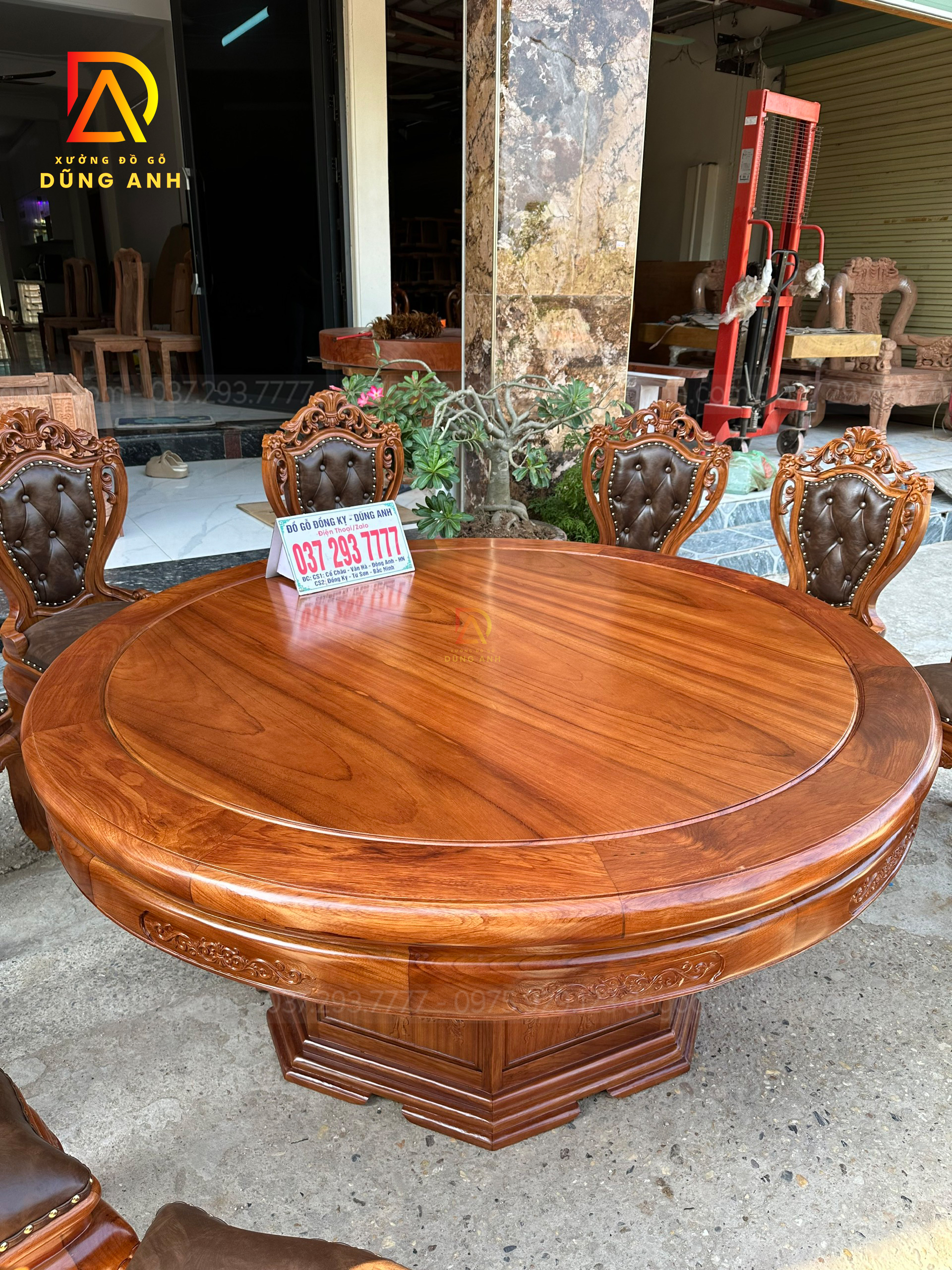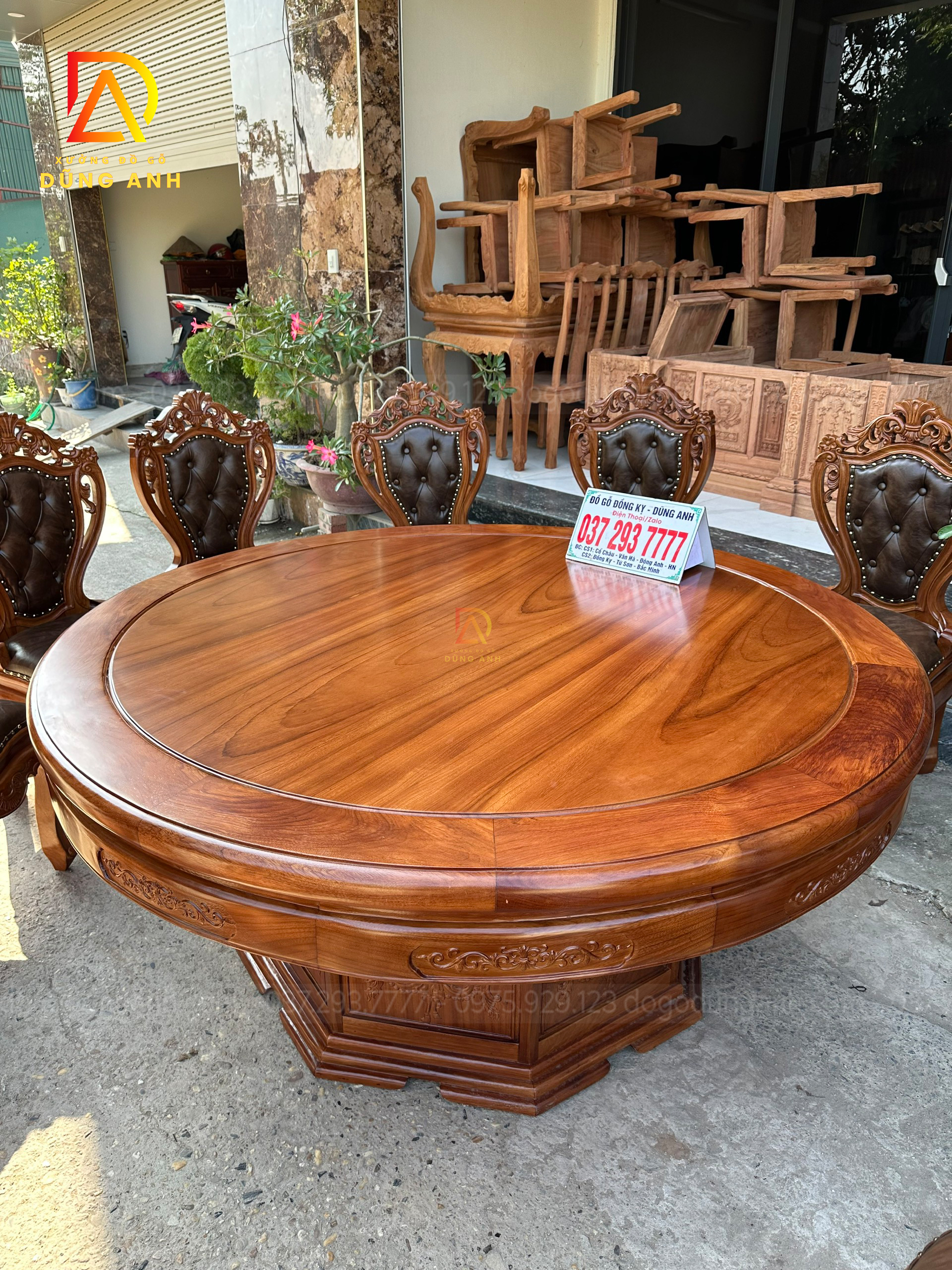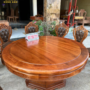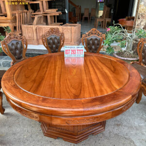 - Chiếc bàn được làm với đường kính là 180 cm , tất cả mặt bàn là mặt trơn và khuôn tranh có độ dày là 3 cm , yếm dày 3 cm và có bản rộng là 12 cm được đục chạm hoa láy tây cực kì tỉ mỉ từ tay các bác thợ lành nghề