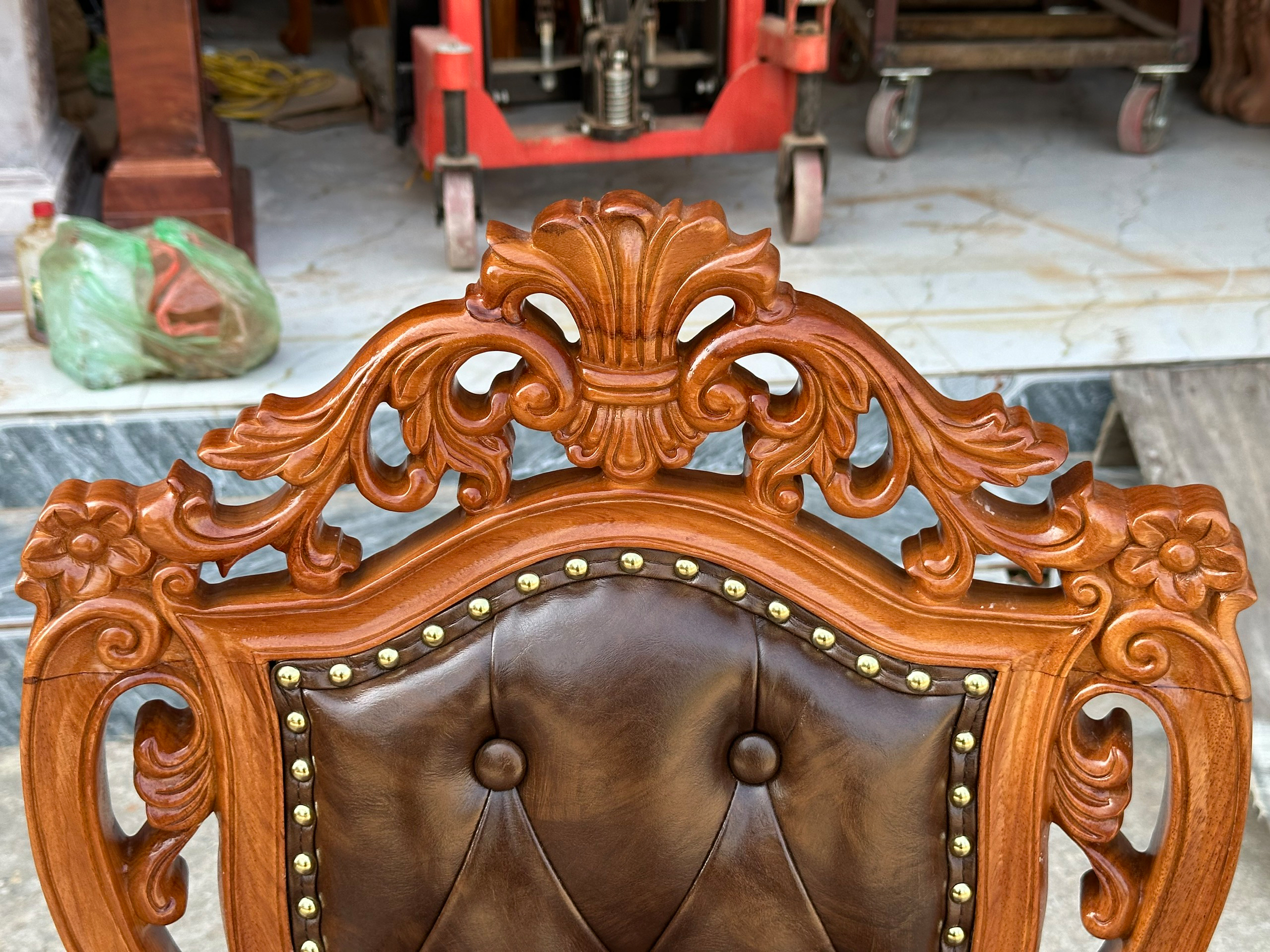SIÊU V.I.P bộ 12 ghế Louis Tân cổ điển bọc da Carola + bàn tròn kích thước khủng – Gỗ Gõ đỏ Pachy
