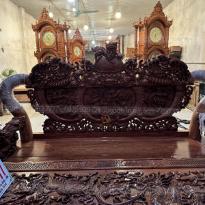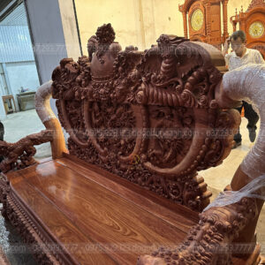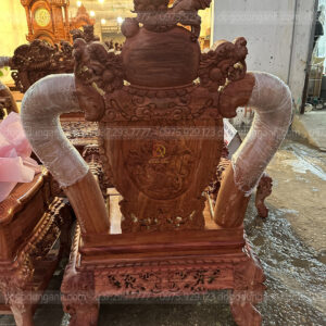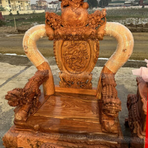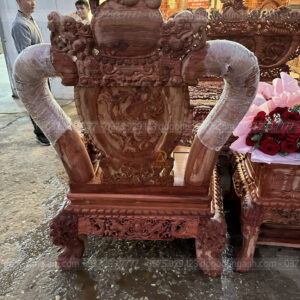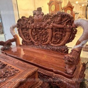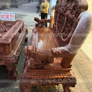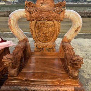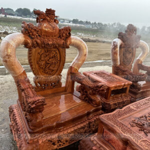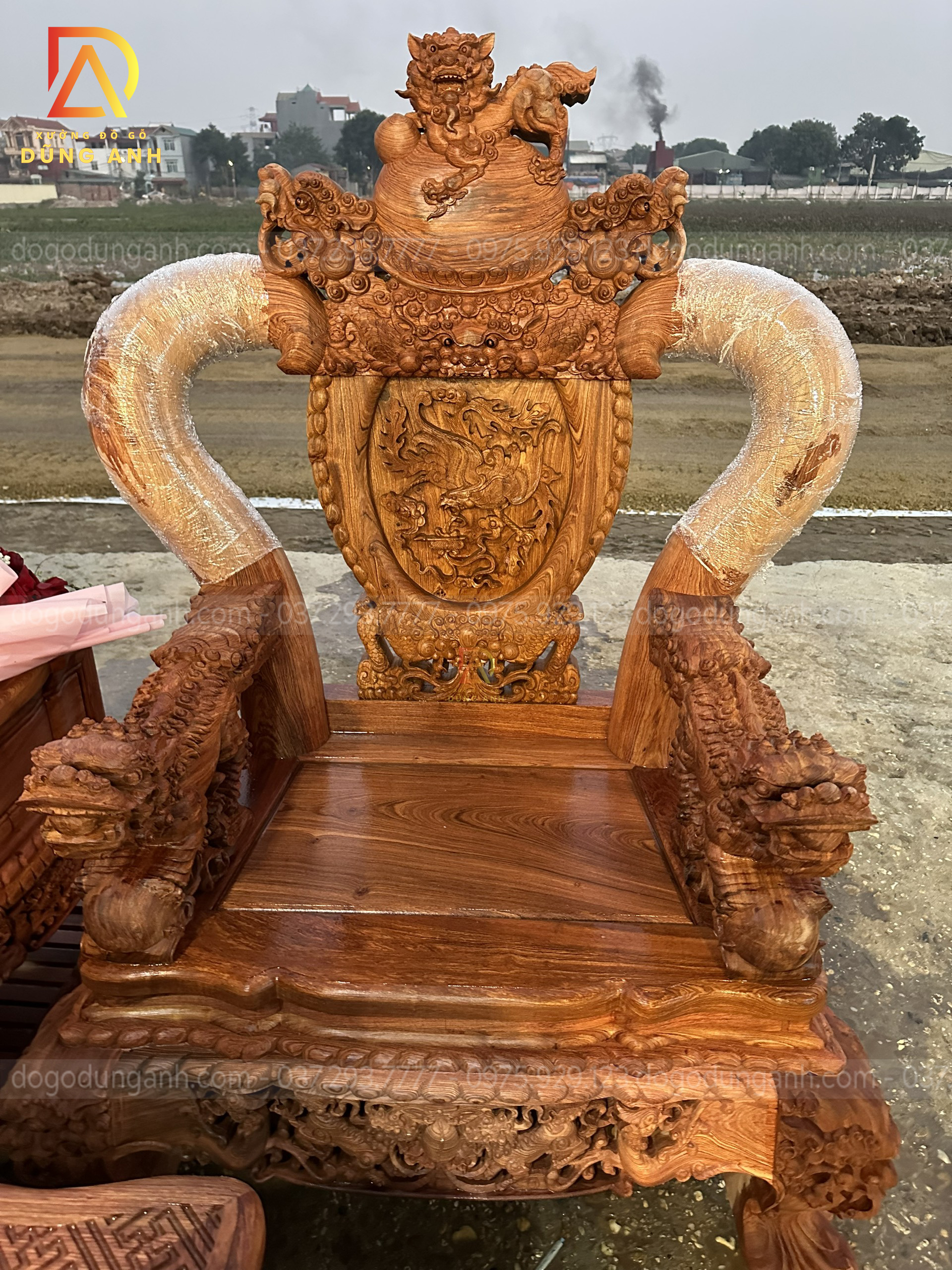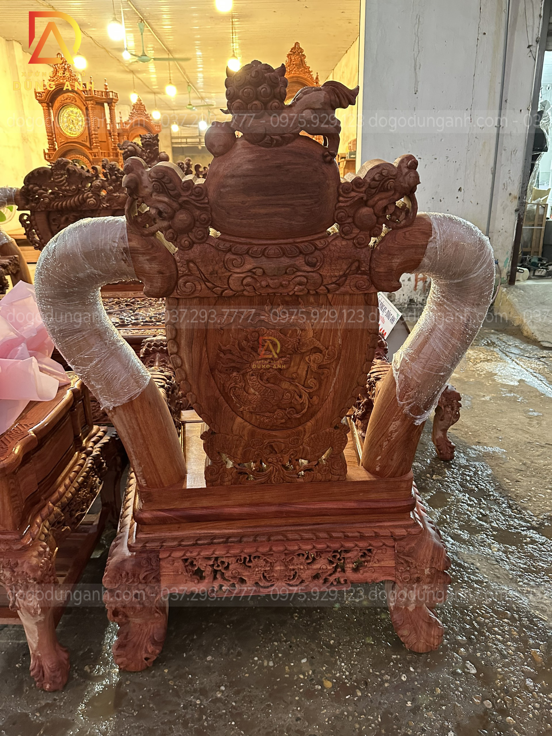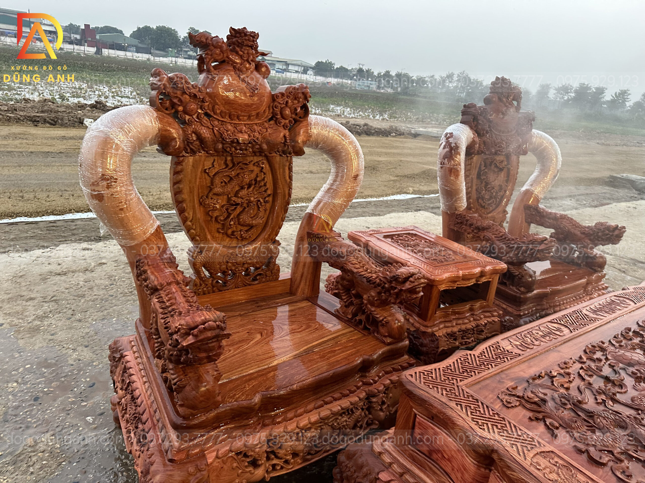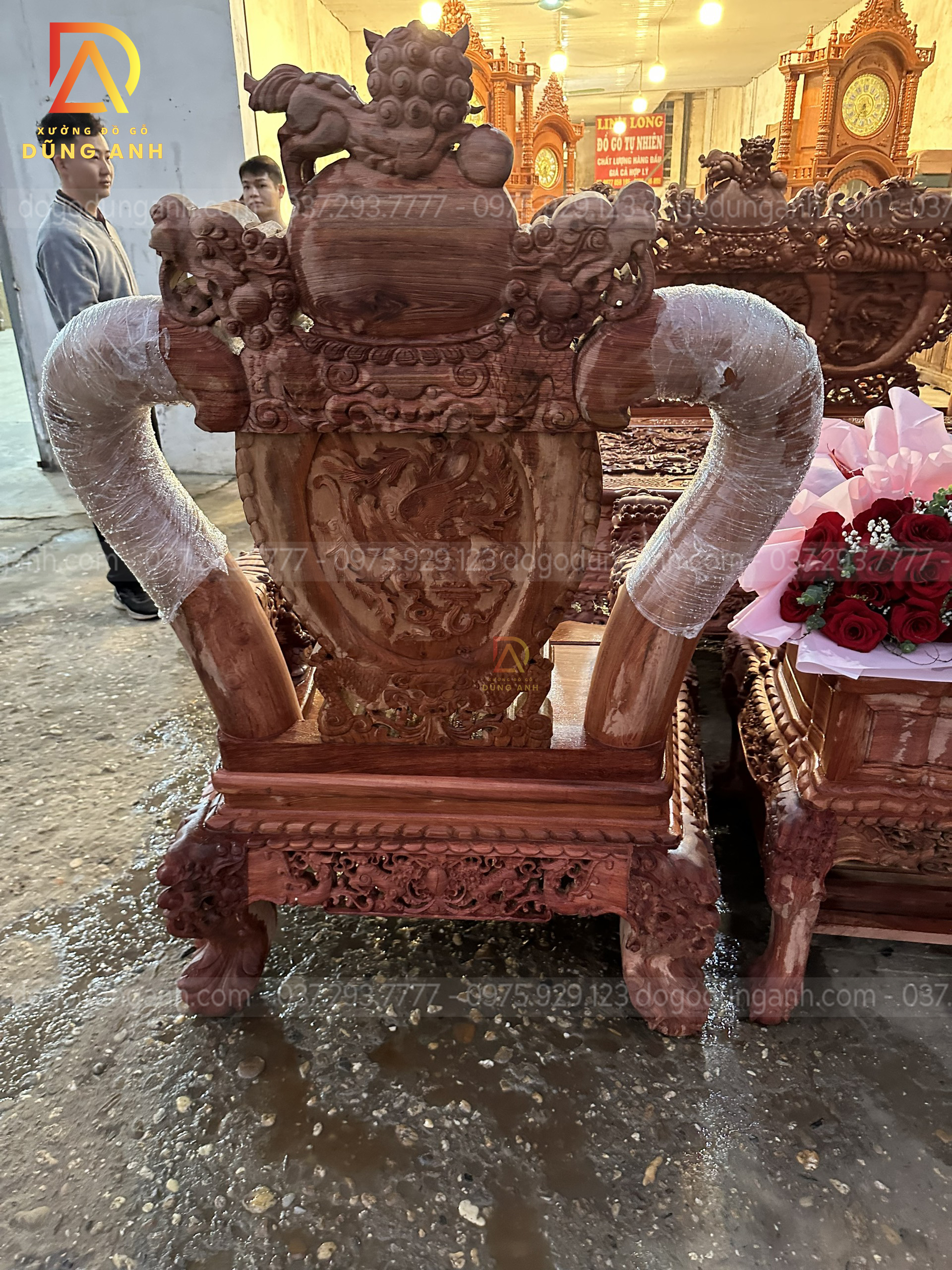 Bộ bàn ghế được bố trí dạng chữ U với mỗi bên gồm 2 ghế đơn kích thước hoành tráng nổi bật với chương nghê 3 đầu và hai vai cột cong bề thế.