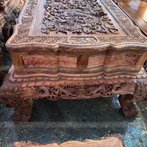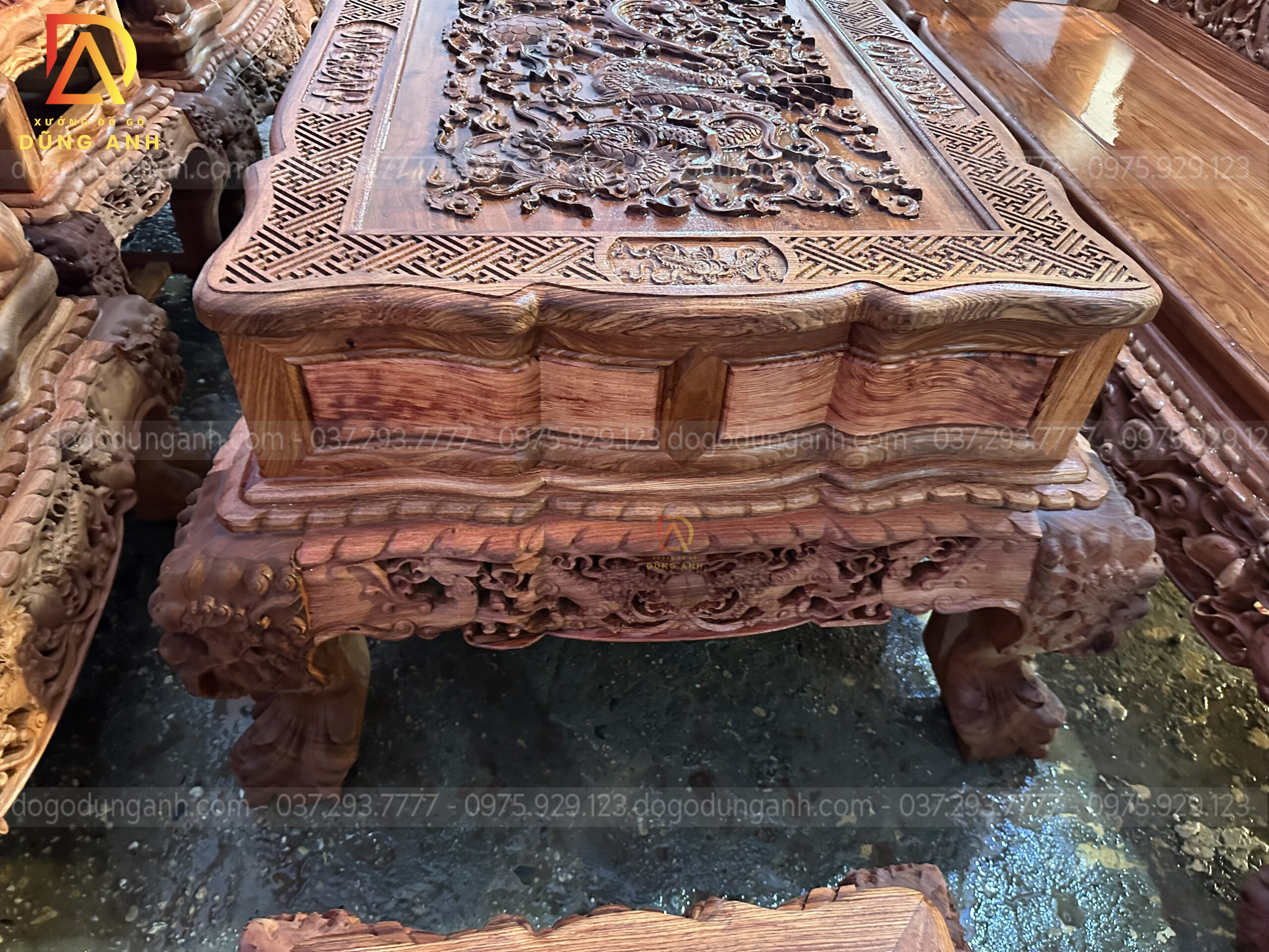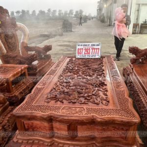 Mặt bàn đươc chạm trổ nhiều họa tiết cầu kỳ, tinh xảo. Nổi bật nhất là hình ảnh Long – Ly – Quy – Phụng quy tụ sinh động. Đây là 4 con vật linh thiêng theo quan niệm của người Á Đông để thể hiện sự sung túc, sức mạnh quyền uy đem lại cuộc sống thịnh vượng, may mắn cho gia đình.
