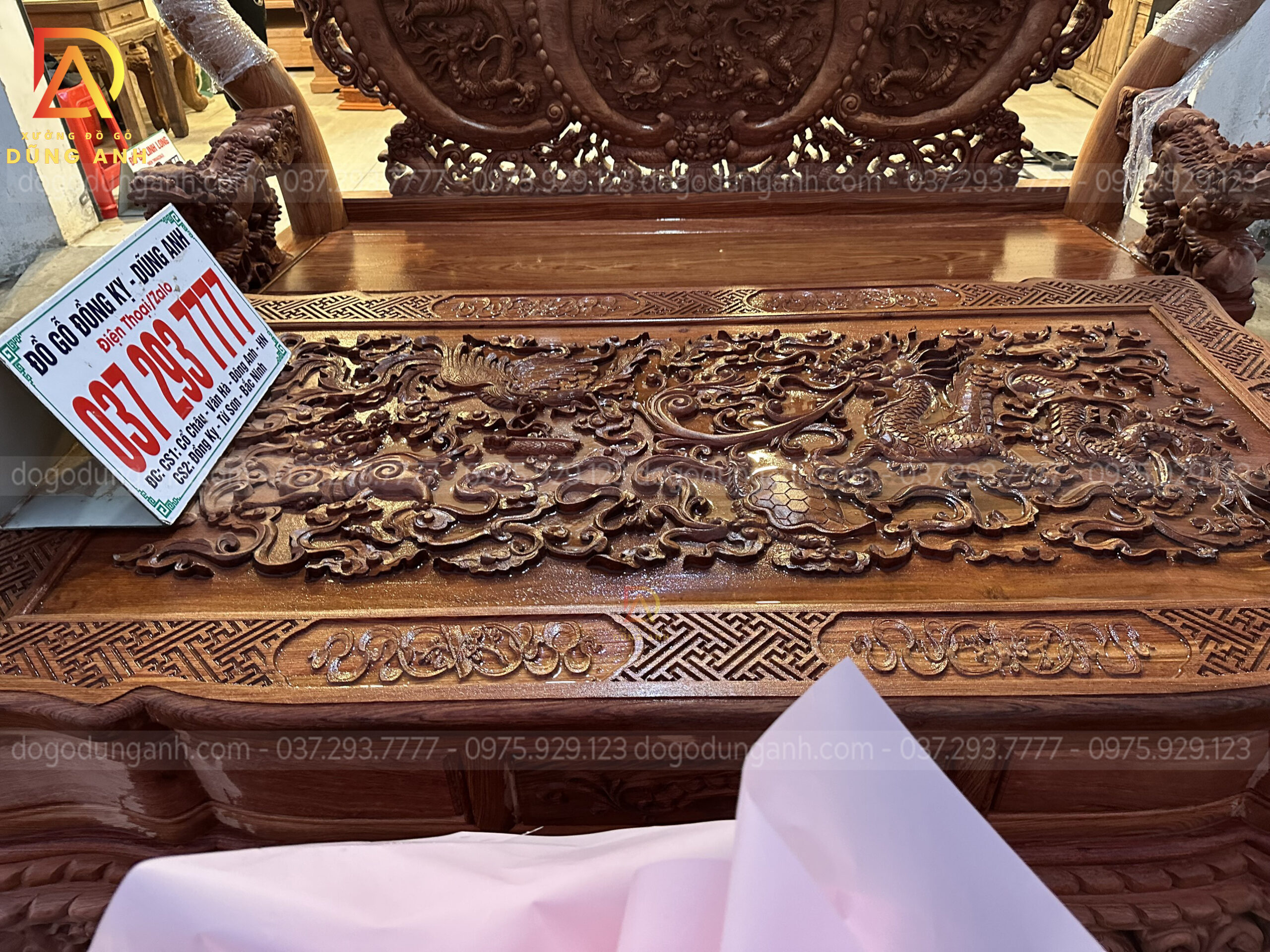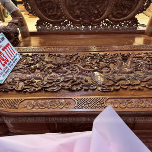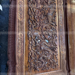 Đoản dài nổi bật với chương đặc đục nghê bảo đỉnh phượng hóa 2 vai vô cùng sinh động và cuốn hút. Phần vách ghế được chia khung vòm sen dẹo bên trong đục tranh tứ linh ở trung tâm và hình ảnh rồng ẩn mình dưới mây chờ thời cơ 2 bên.